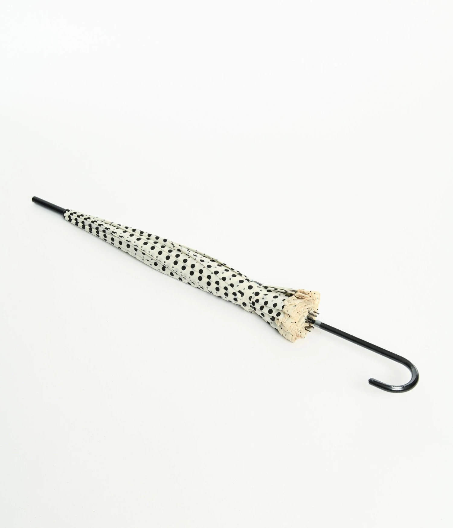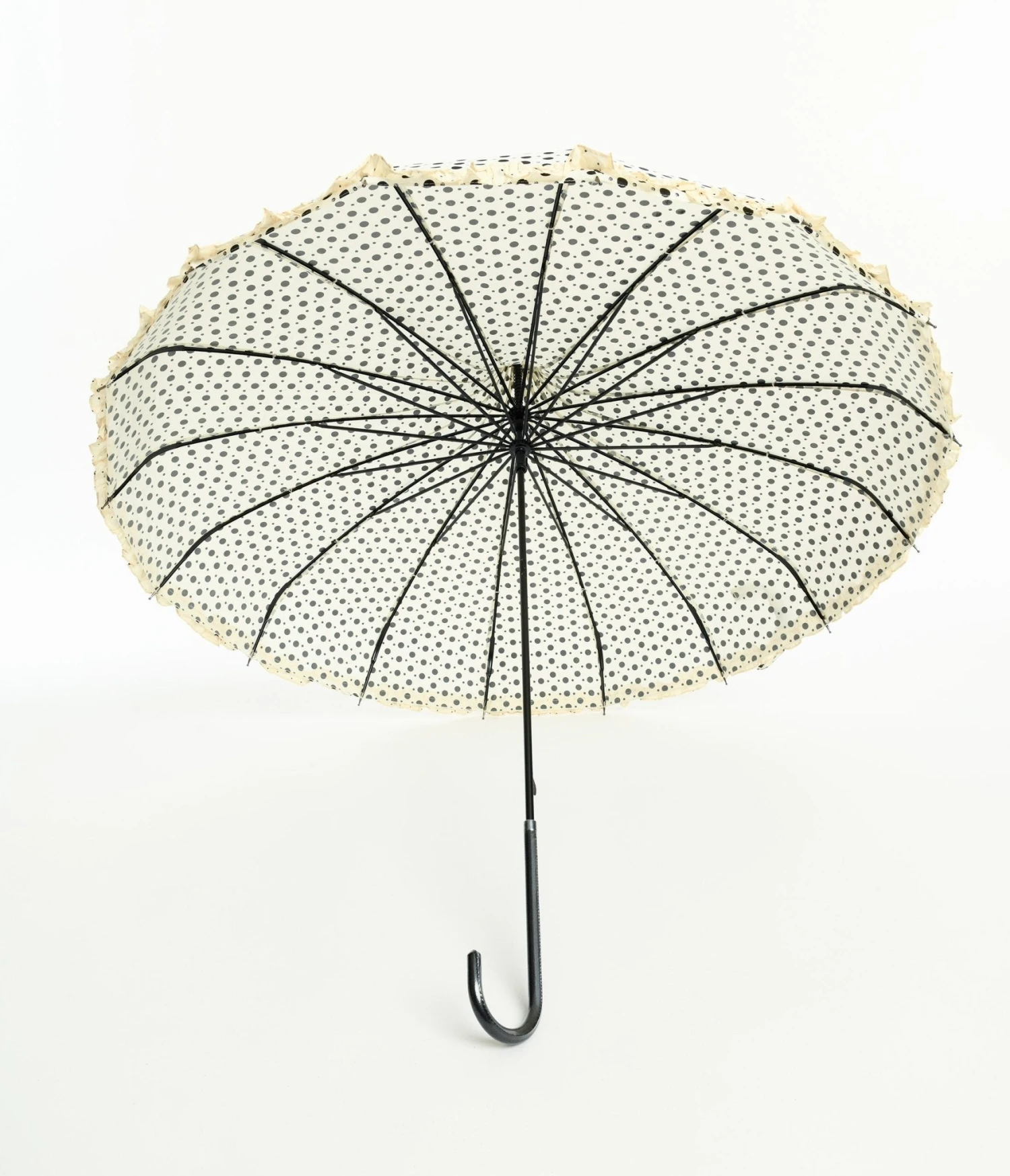 This elegant Victorian inspired pagoda umbrella is crafted in a cream and black glitter polka dot material with a frill trim. It features 16 steel ribs, a manual opening mechanism, and a hooked handle.