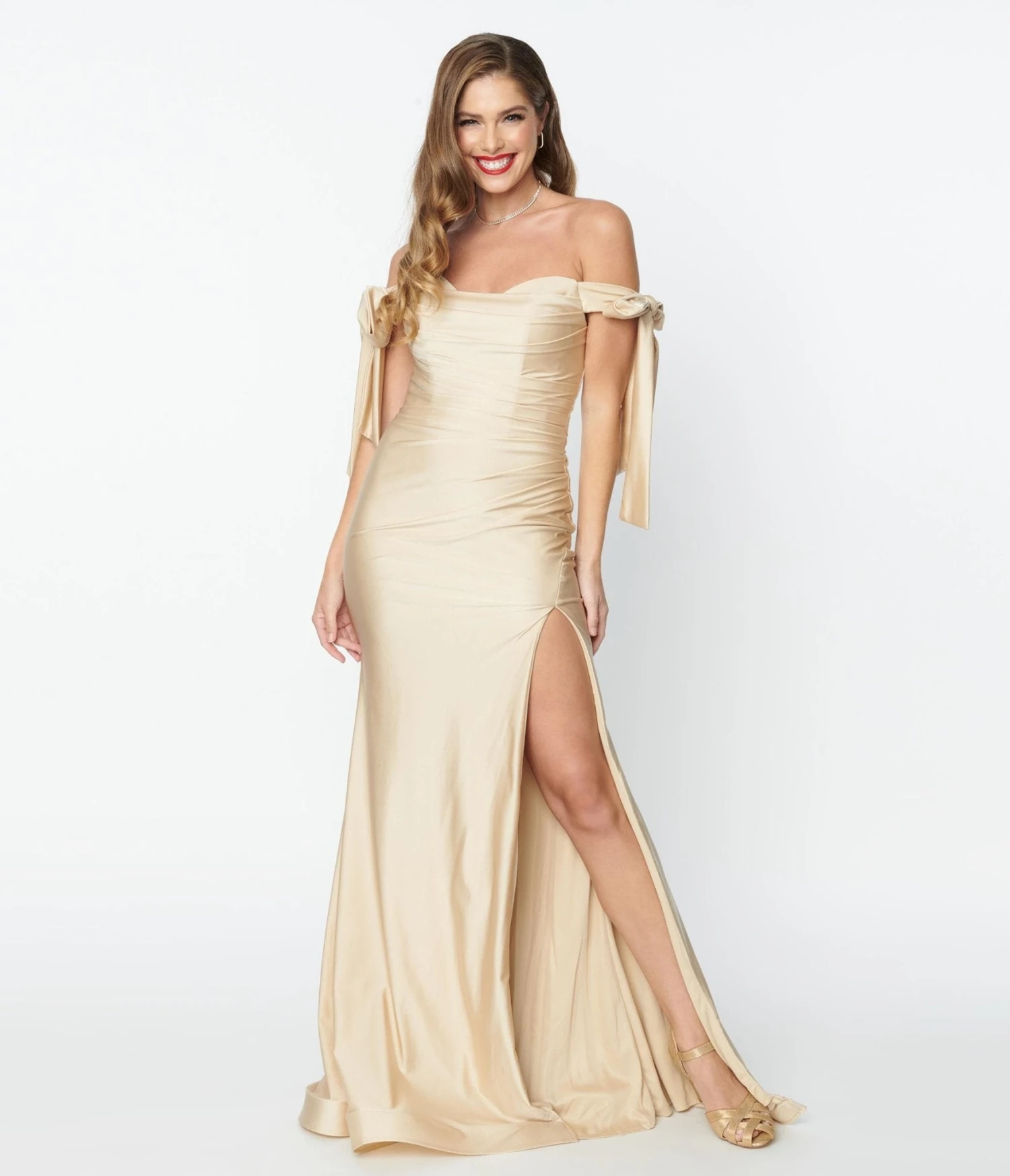 This gorgeous gown is crafted in a dazzling champagne satin. The ruched bodice is accented with self tie off the shoulder straps, while the maxi length skirt boasts a short train and sultry side slit. Outfitted with a back zipper!
