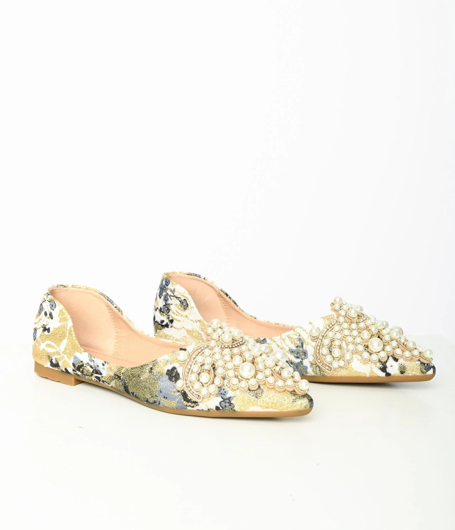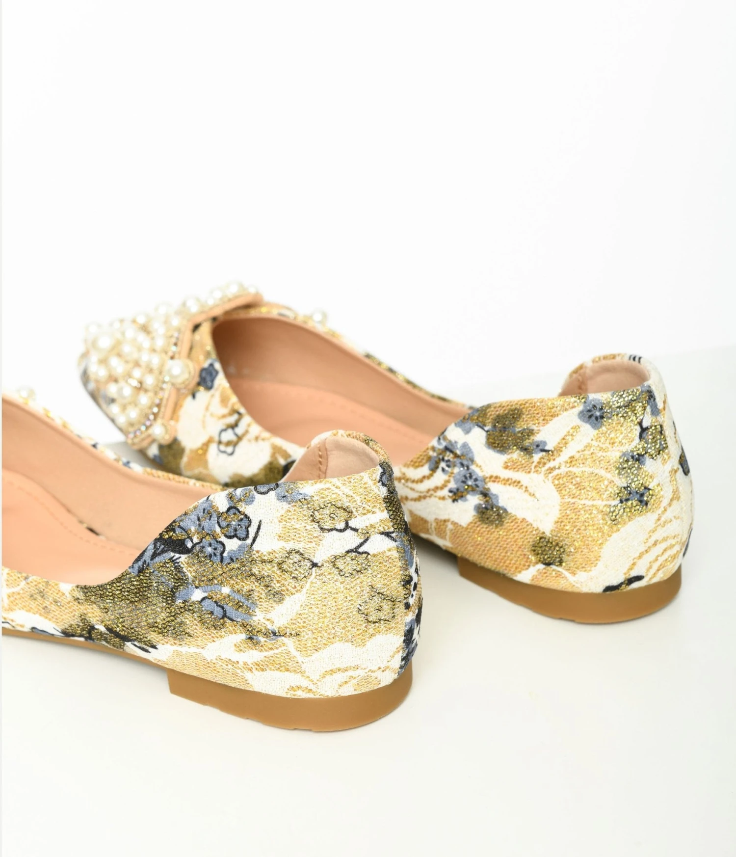 Step into the whimsical world of style and elegance with these floral flats adorned with faux pearls! Complete with a pointed toe vamp.