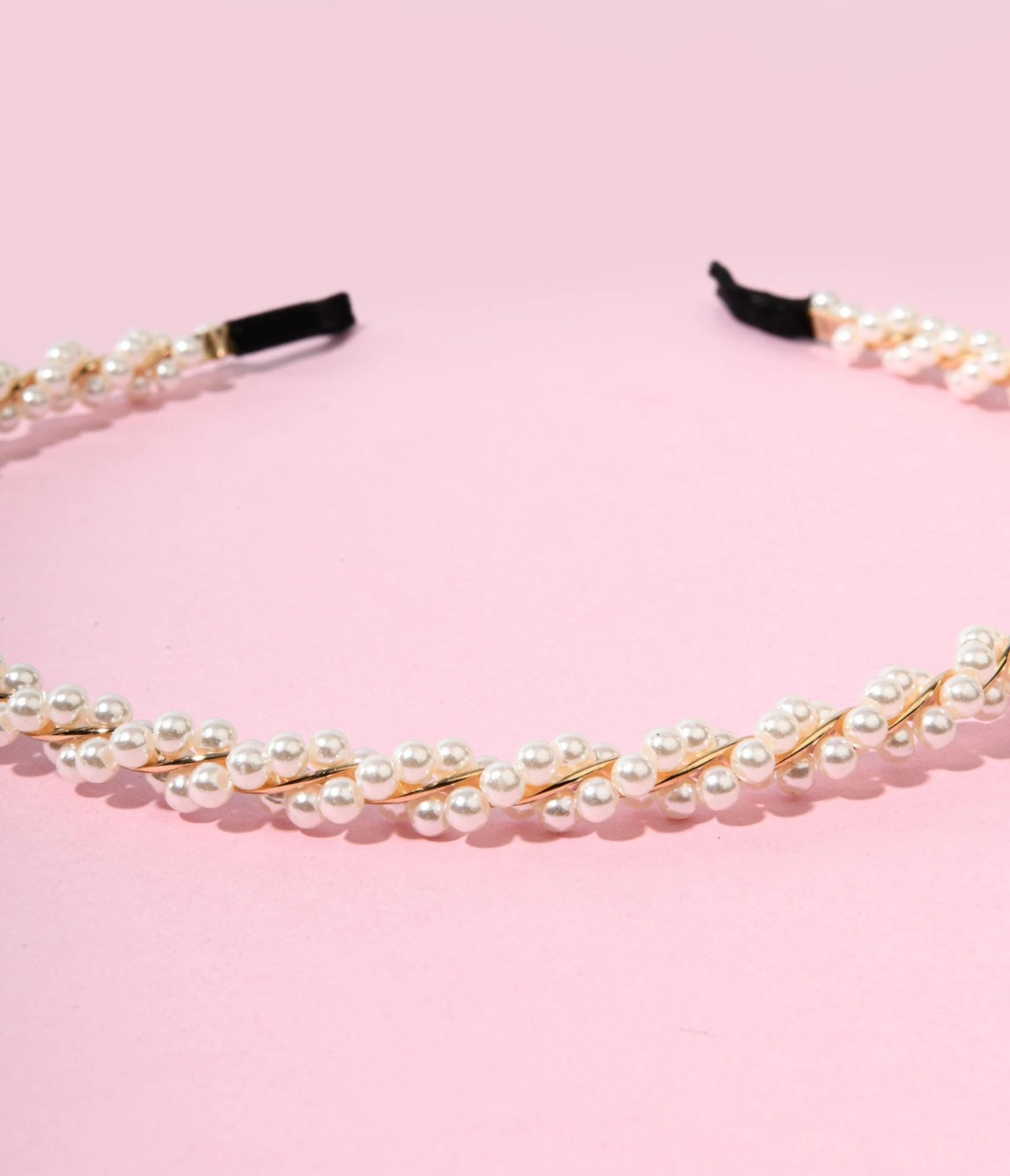 This gold thin headband showcases delicate faux pearl twists along a twisted vine design. It effortlessly adds a touch of sophistication and grace, making it perfect for special occasions or simply adding a little extra flair to your daily style.