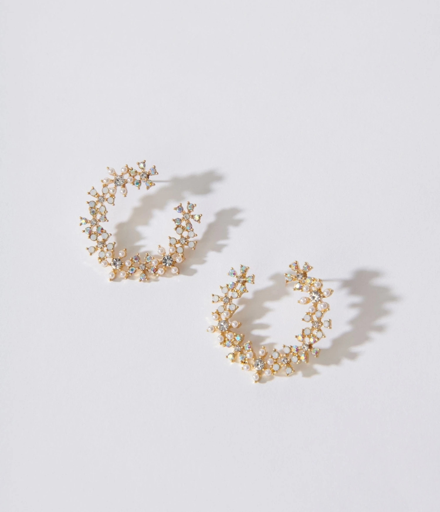 These lovely golden earrings feature dazzling rhinestones set in floral shaped hoops. Complete with post backs.
