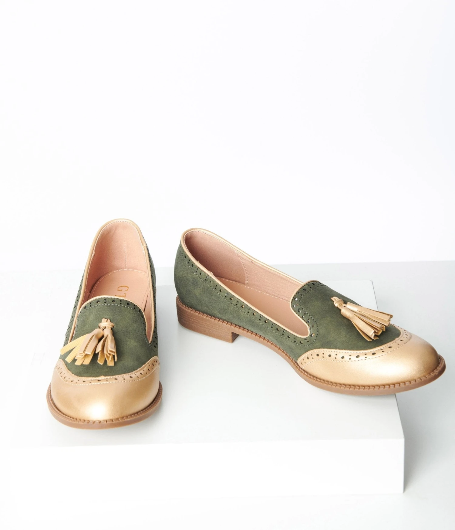 These adorable flats are crafted in a stunning green faux suede, accented with a metallic gold leatherette rounded toe and tassel. Complete with oxford style details.