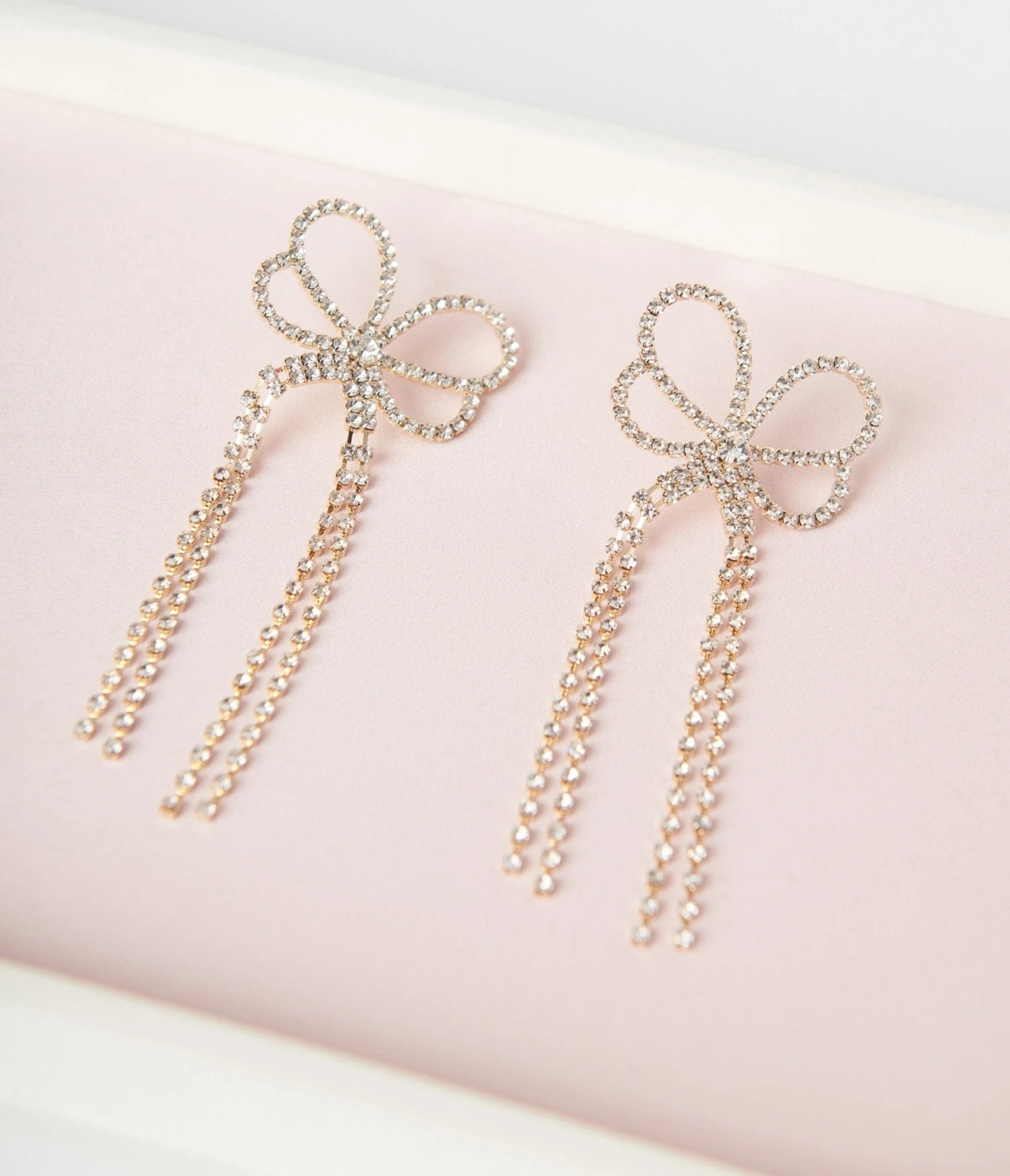 These gorgeous dangle earrings boast silver rhinestones set in gold hardware featuring a bow design. Complete with post-backs.