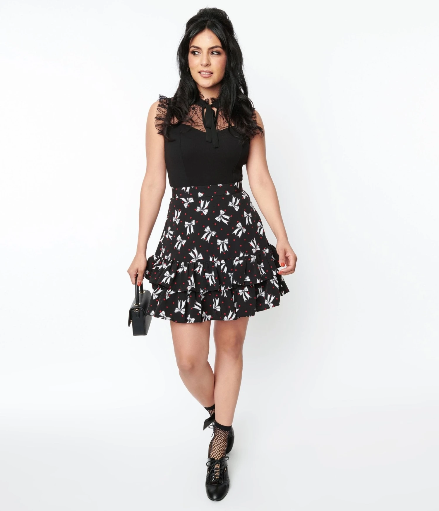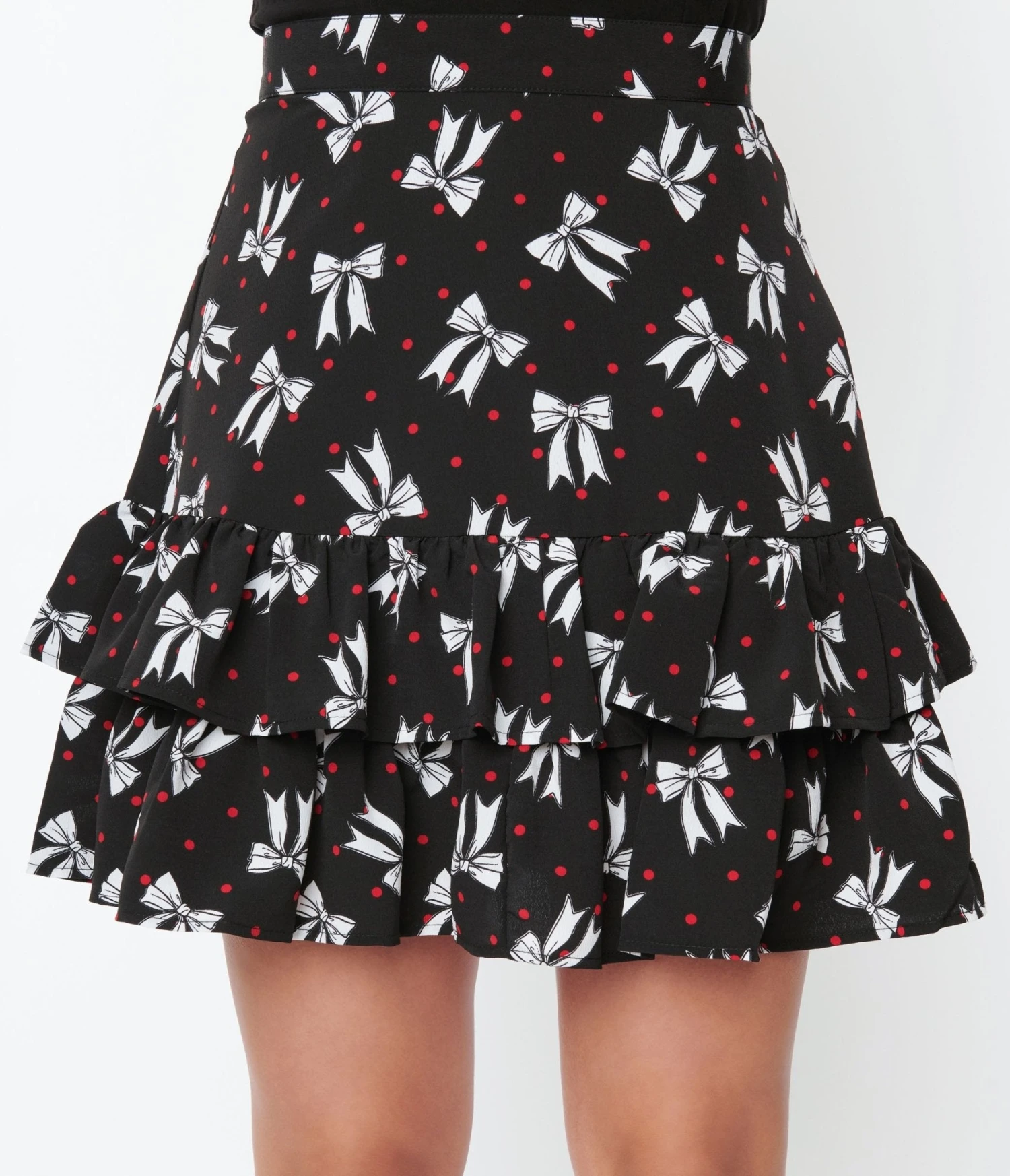 Crafted from a lovely woven crepe fabric, this stunning black skirt flaunts flirty ruffled tiers that will make you twirl with delight. Adorned with charming white bows and eye-catching red polka dots, it’s bound to turn heads wherever you go. With its flattering A-line silhouette and convenient back zipper, this skirt effortlessly combines style and comfort.