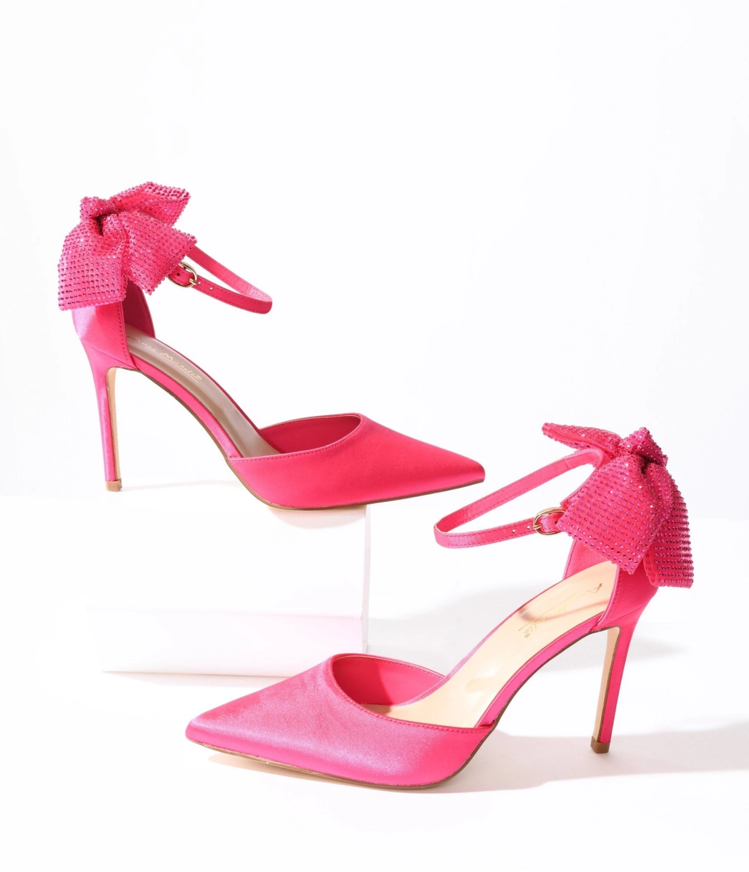 Unleash your inner fashionista with these sizzling hot pink stiletto heels adorned with a charming rhinestone bow detail on the back. Complete with a pointed toe vamp, adjustable ankle straps, and 4 inch heels.