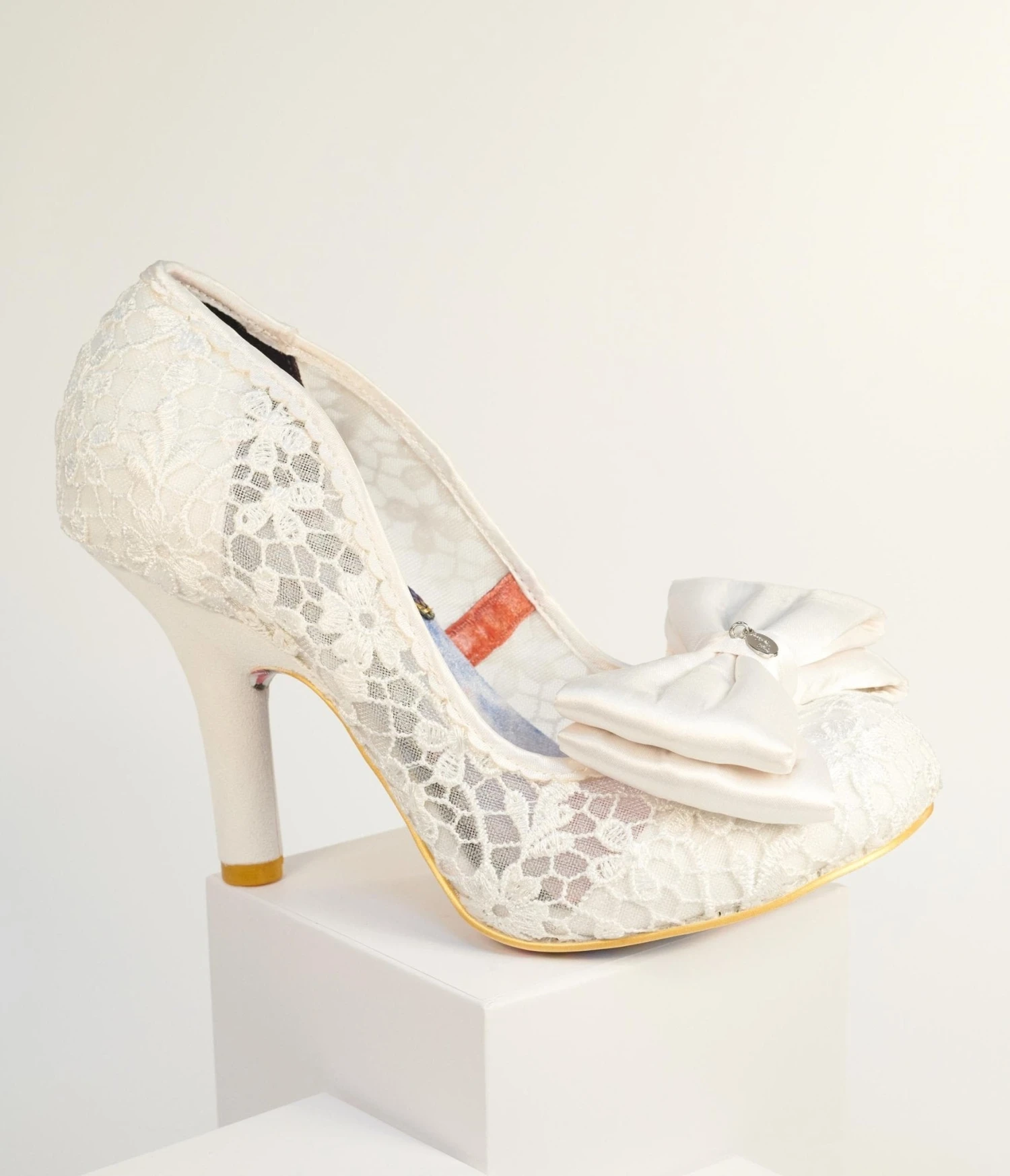 Dance the night away, darling. These sweet wedding shoes from Irregular Choice are an enchanting pair in ivory floral mesh lace that drops to a rounded toe topped with a beautiful satin bow. With an elegant four inch heel, cushioned insole, and iconic printed sole, youÕll never want to leave the dance floor!