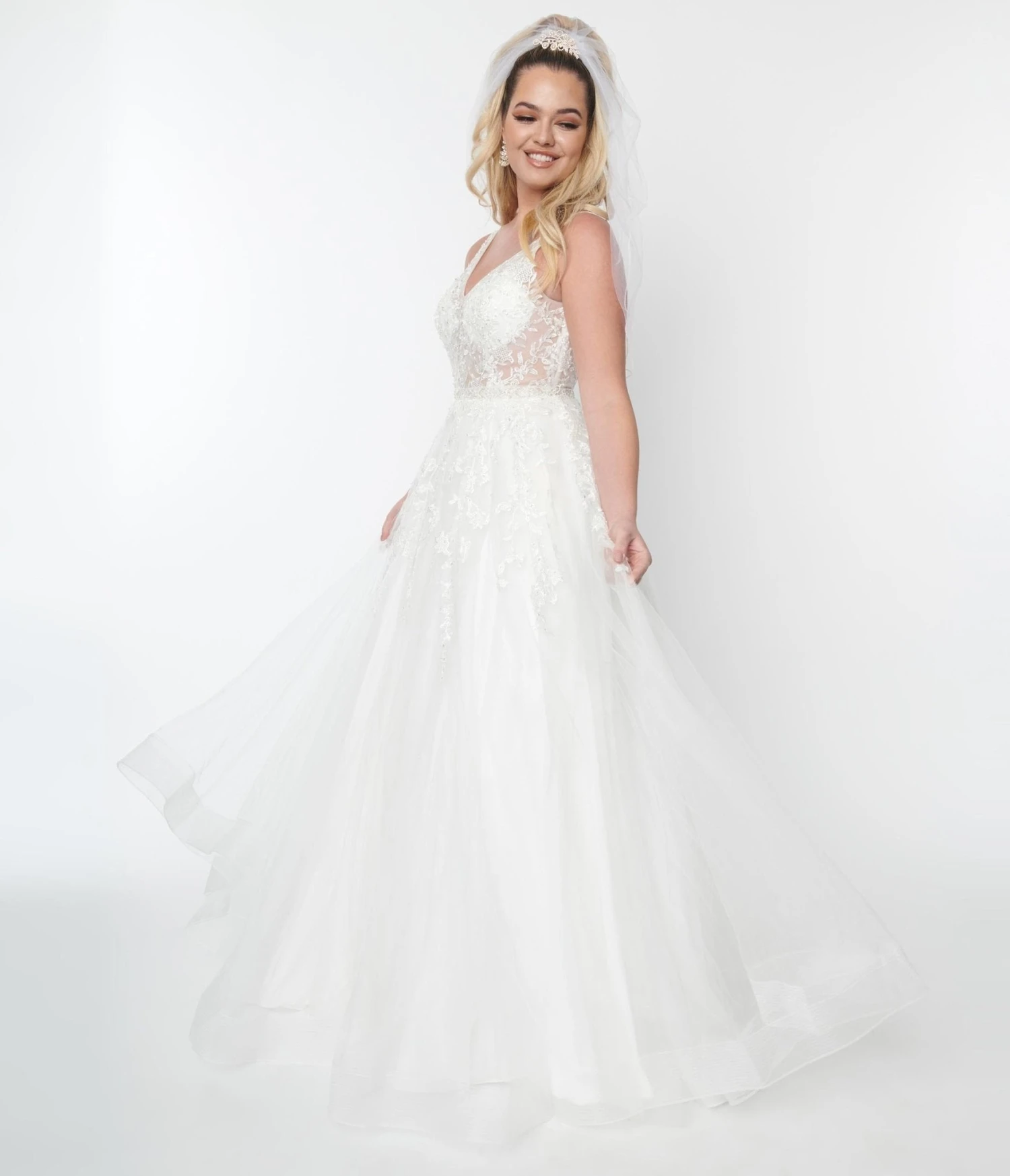 This long floral embroidered ivory bridal gown mesmerizes with a semi-sheer floral lace bodice, V-neckline, and sleeveless silhouette. The full length tulle skirt cascades over a matching lining, and is cinched by the attached belt, and back buttons.