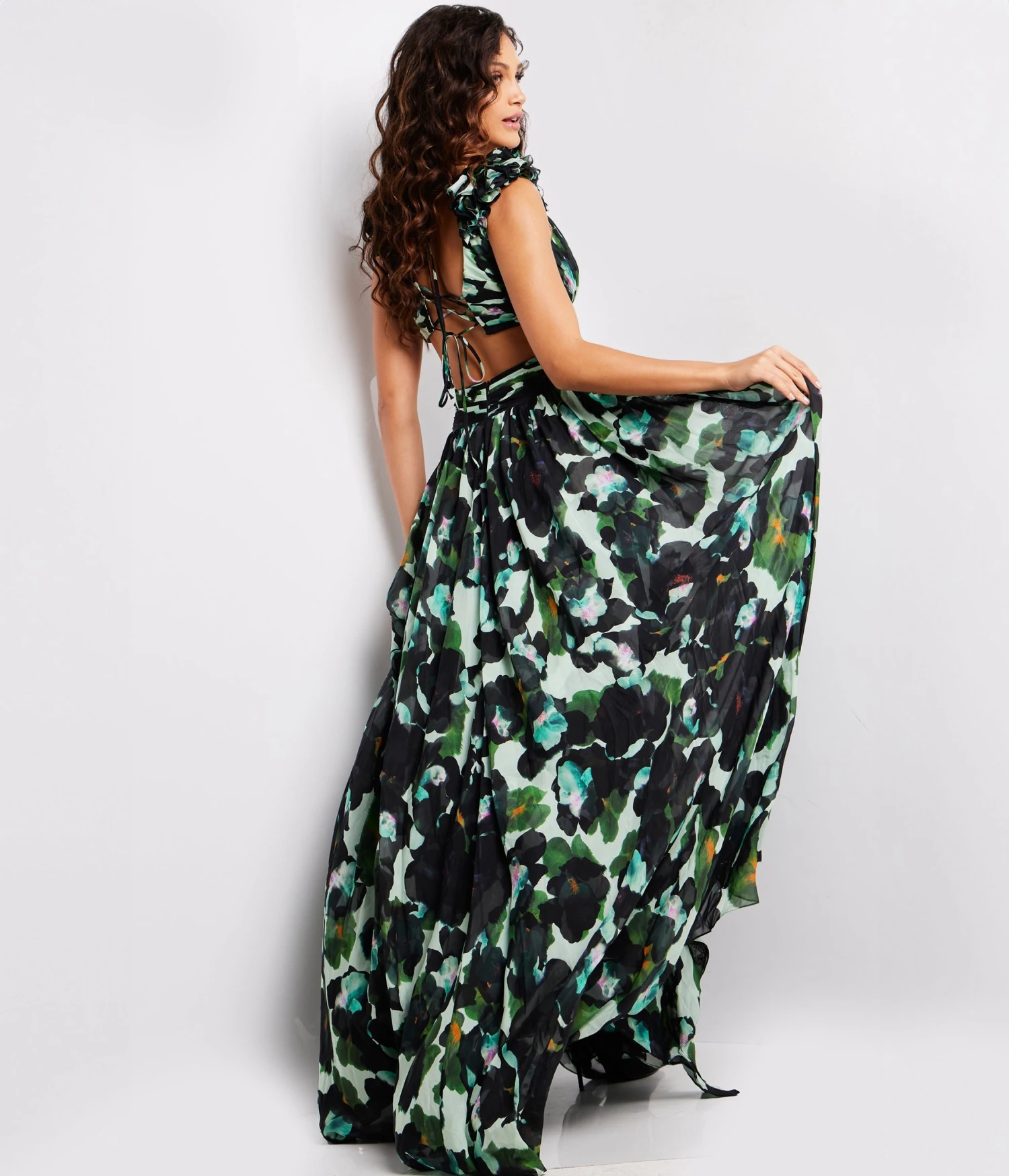 Crafted from flowing chiffon, the dress offers an airy and elegant feel, ensuring both comfort and sophistication. Following a maxi style, the dress boasts a floor-length silhouette that adds a touch of glamour to any formal event. With intricate details, including a vibrant print, cutouts, and a criss-cross high waist, the dress exudes contemporary chic and captures attention with its unique elements. Ruffle shoulders add a playful and feminine touch to the overall design, enhancing the dress’s charm and visual appeal. A high slit adds a hint of allure and movement, allowing the wearer to showcase elegance with each step. The open back style of the dress contributes to its modern and daring aesthetic, ensuring a memorable look from every angle. Featuring a V-neckline, the dress combines elegance with a touch of allure, drawing attention to the neckline and collarbone. Sleeveless in design, the dress allows for freedom of movement and complements its overall chic and sophisticated aesthetic.