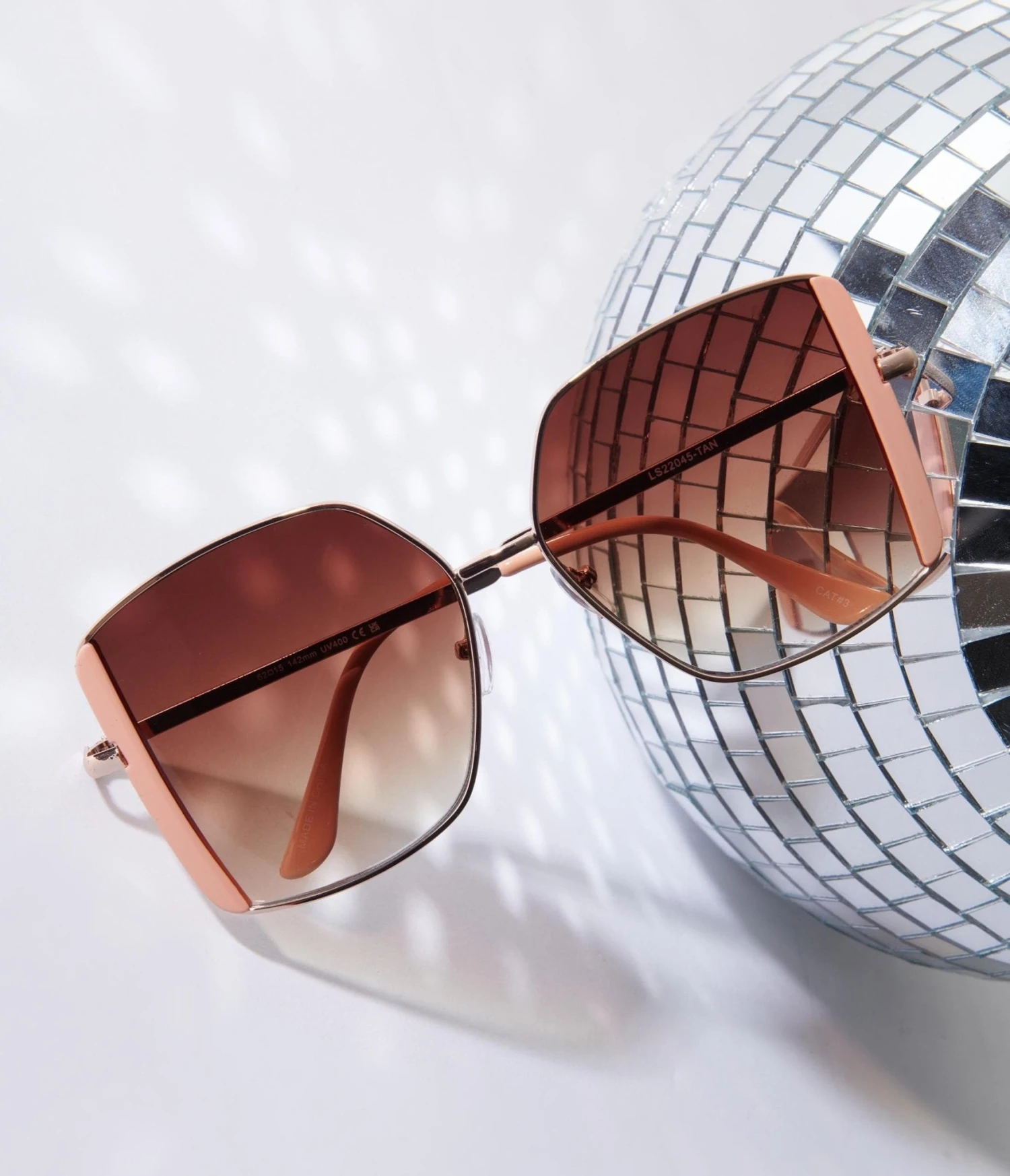 This oversized sunglasses features ombre tinted lenses, golden hardware wire frames, and subtle pink accents. Complete with curved arms and silicone nose pads.