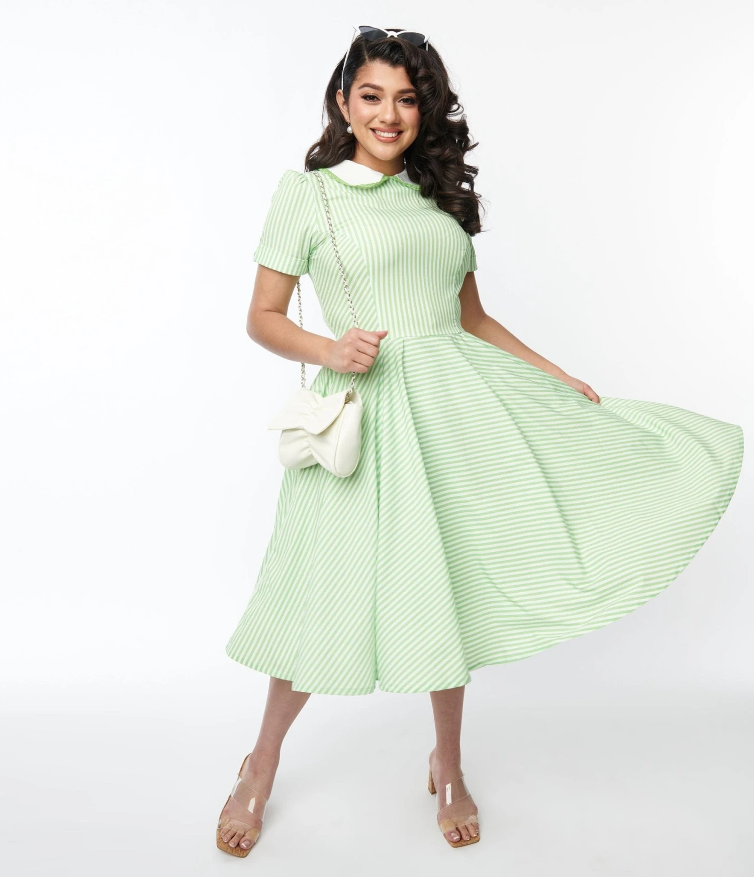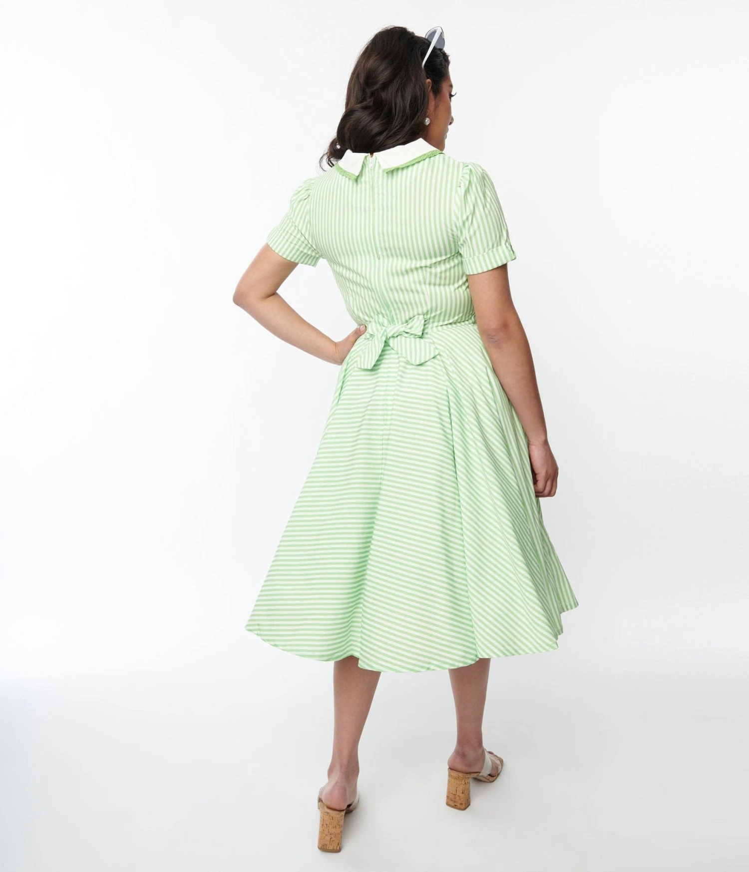This fun 1940s style swing dress is set in a lime green and white striped woven. Outfitted with a lace trim Peter Pan collar and short cuffed sleeves. Complete with a back zipper and side pockets.