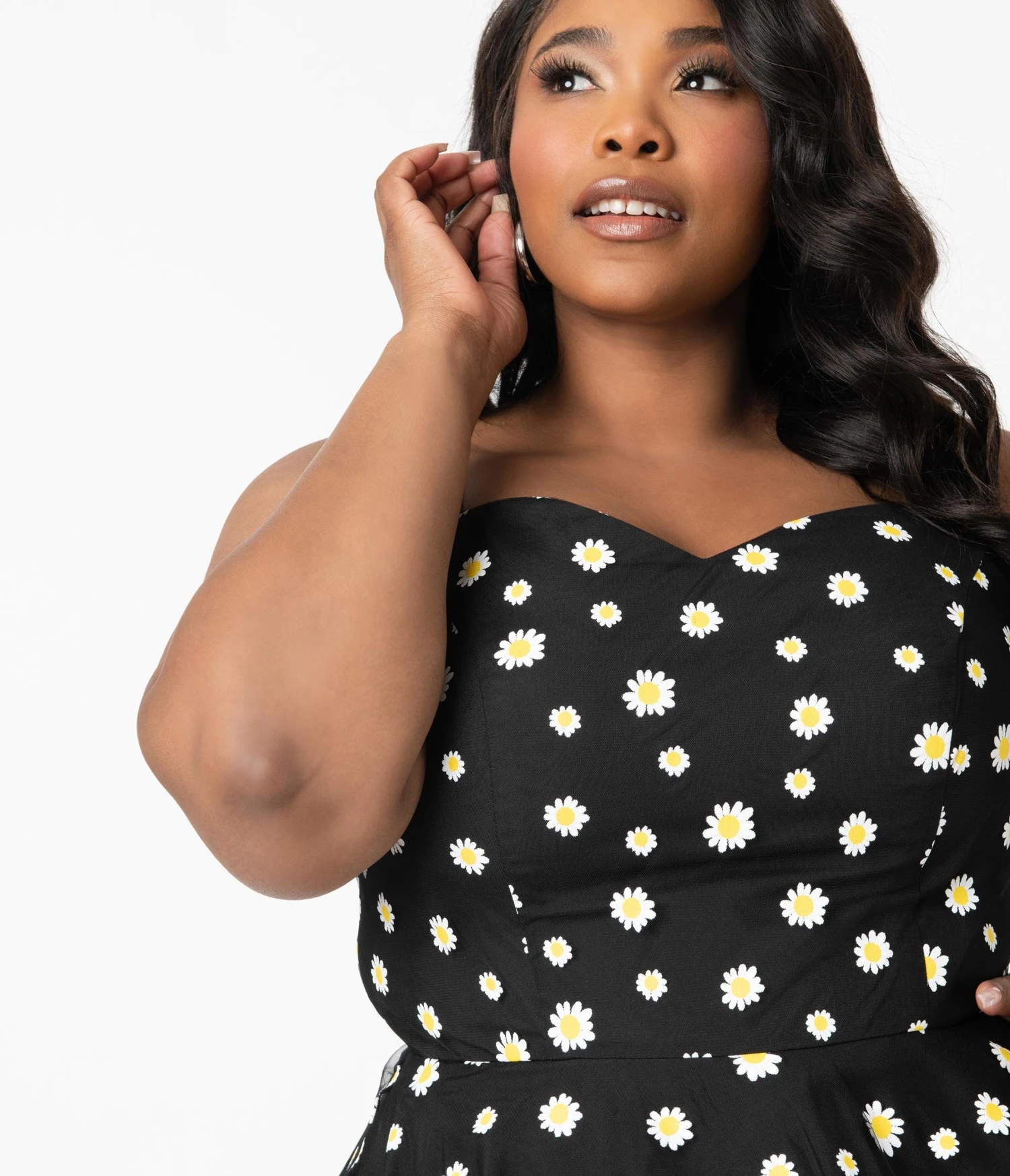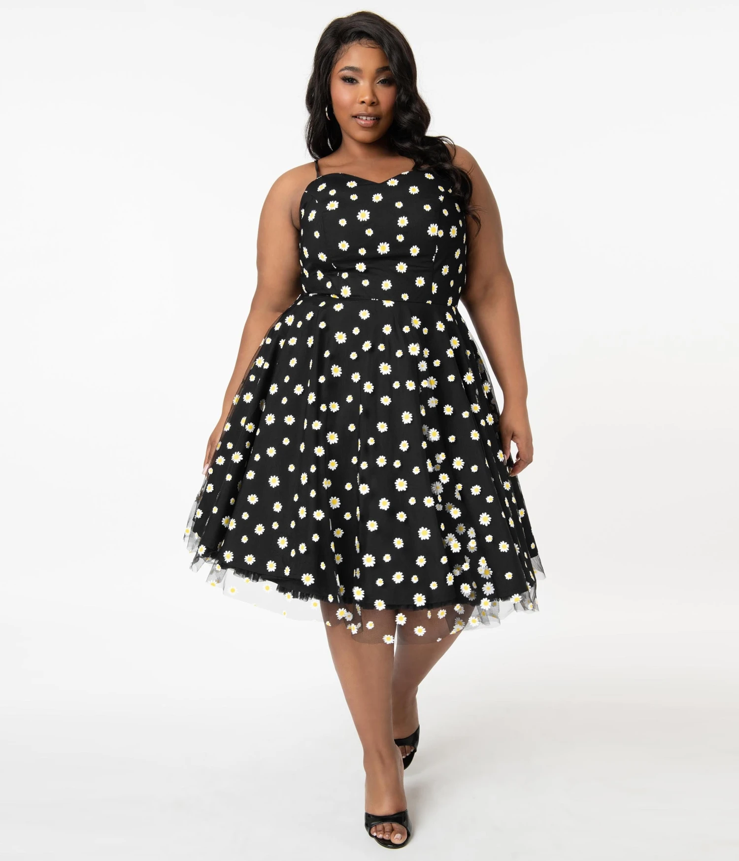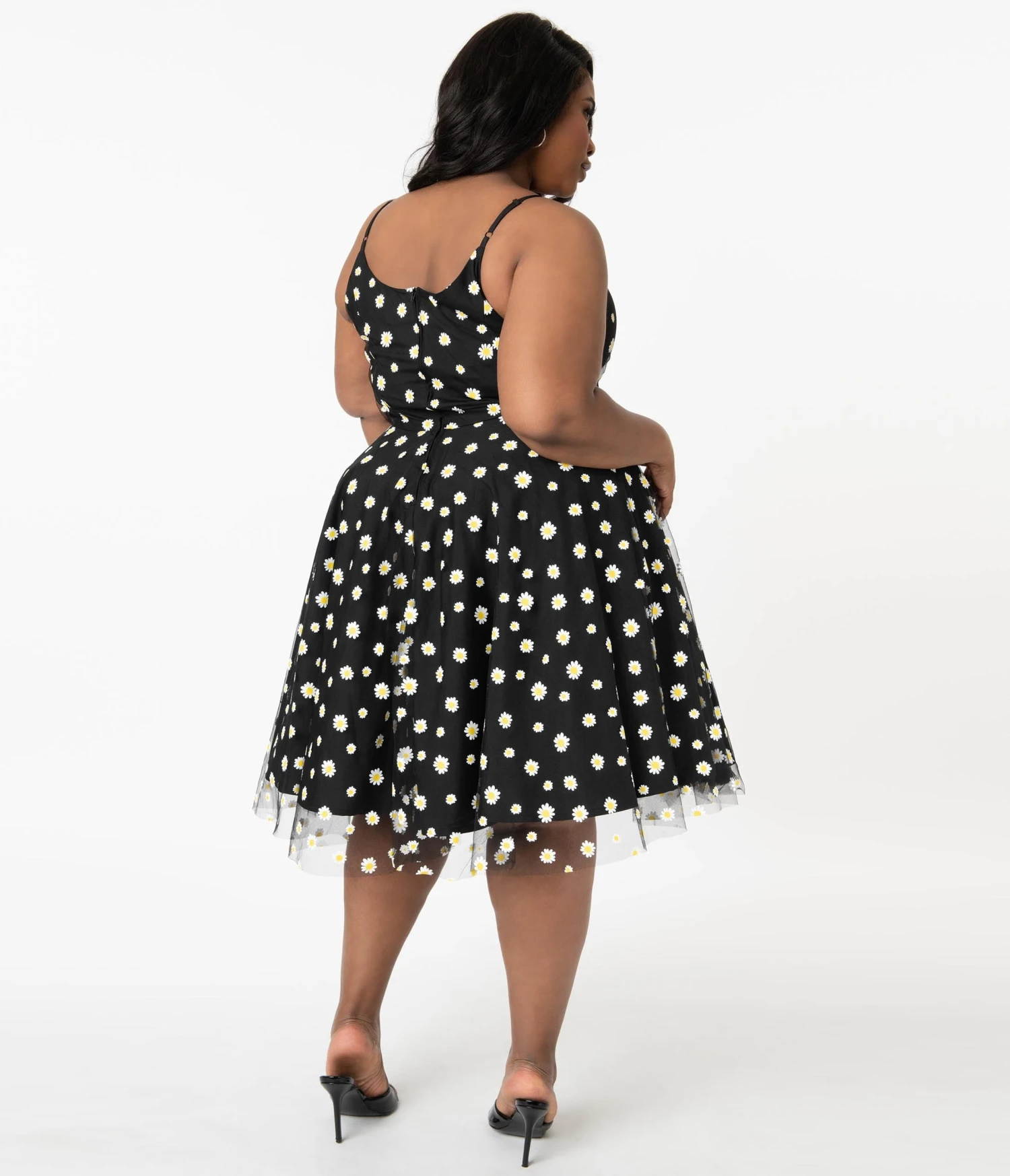 Sweet daisy dreams, darling! This flirtatious plus size swing dress is a lightweight wonder in a beautiful black mesh that dances with a white daisy screen print over smooth black lining. The princess seamed bodice is secured with adjustable spaghetti straps, while the seamed waist is cinched with a back zipper. The sweeping swing skirt allows enough room for a petticoat pop for a rockabilly connection!
