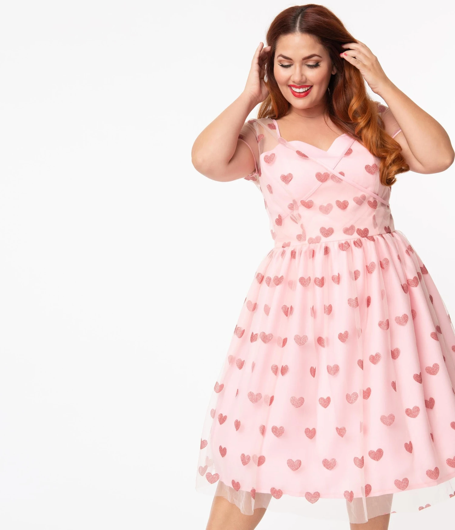 You’re the sweetest heart, darling! An ethereal vintage inspired plus size dress in a delicate light pink mesh, this dreamy silhouette sparkles with pink hearts in a shimmering glitter print. The sweetheart neckline and princess seamed bodice is flattering with an overlay of light pink mesh that provide sweet short sleeves as the seamed waist tops a lovely gathered swing skirt. Complete with light pink lining and a back zipper to cinch in your figure, don’t blink dear – it may disappear.