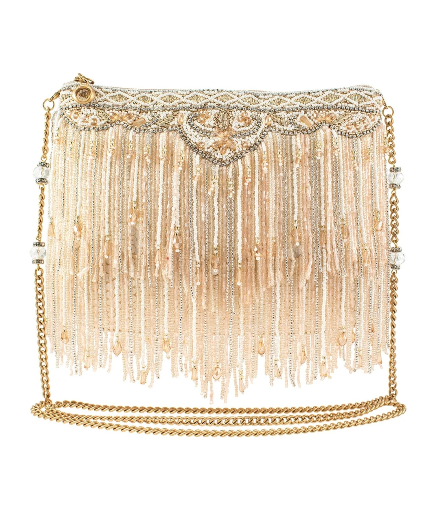 This crossbody bag from Mary Frances is nothing short of sweet! Crafted with layers of beaded fringe and faceted crystals that’s ready to hit the town. Outfitted with an inner pocket, a zipper closure, and a removable crossbody chain strap.
