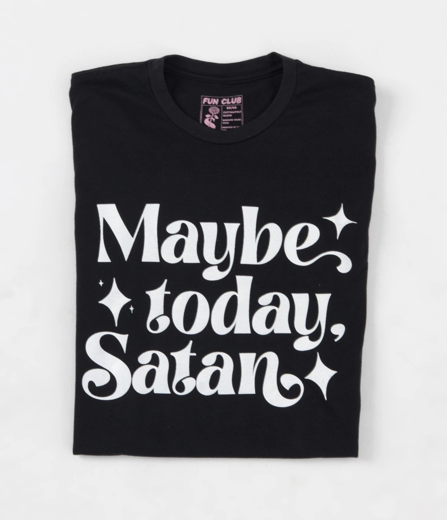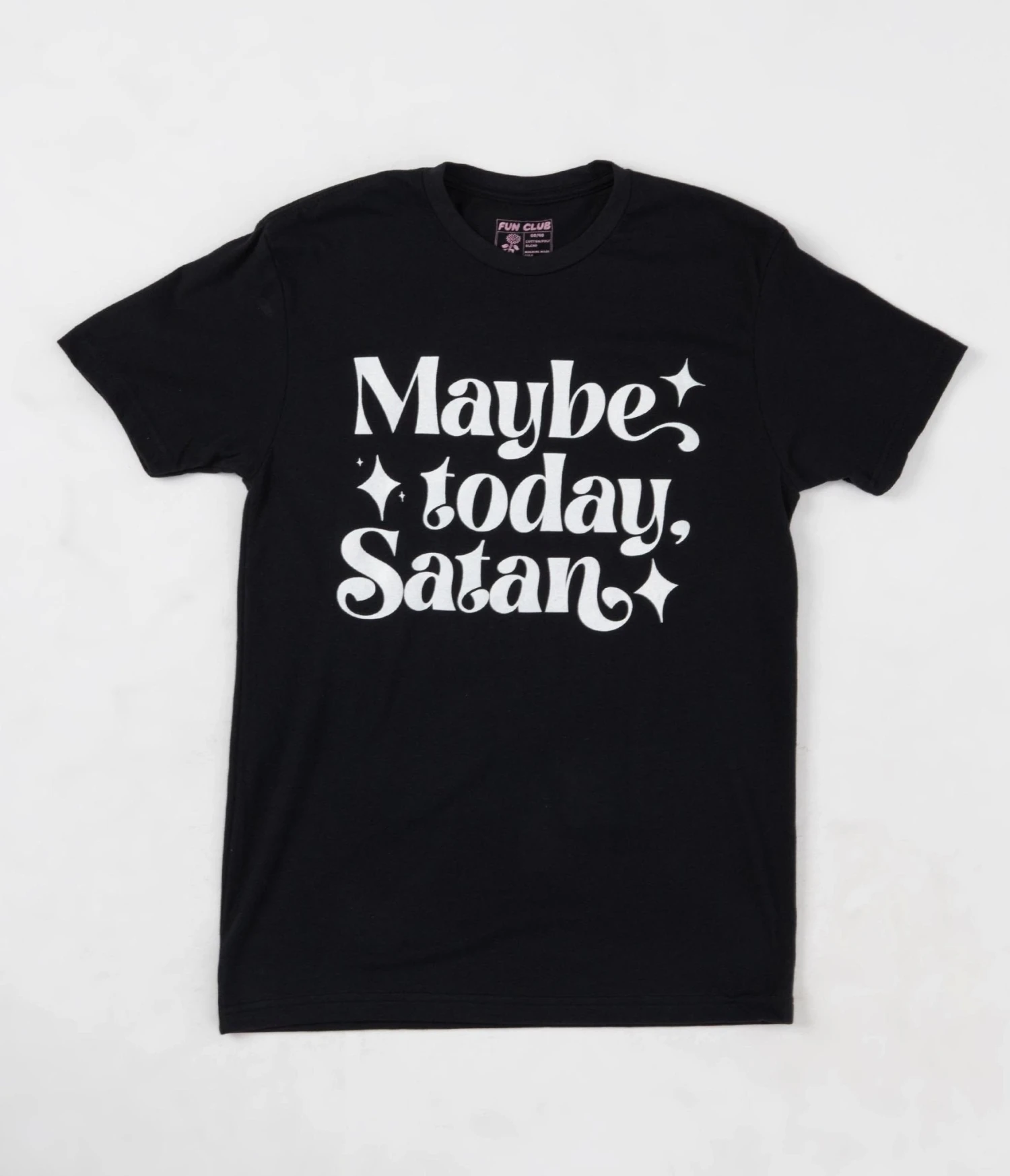 This unisex tee is crafted in a black cotton blend and boasts the cheeky white font ‘Maybe Today Satan’.