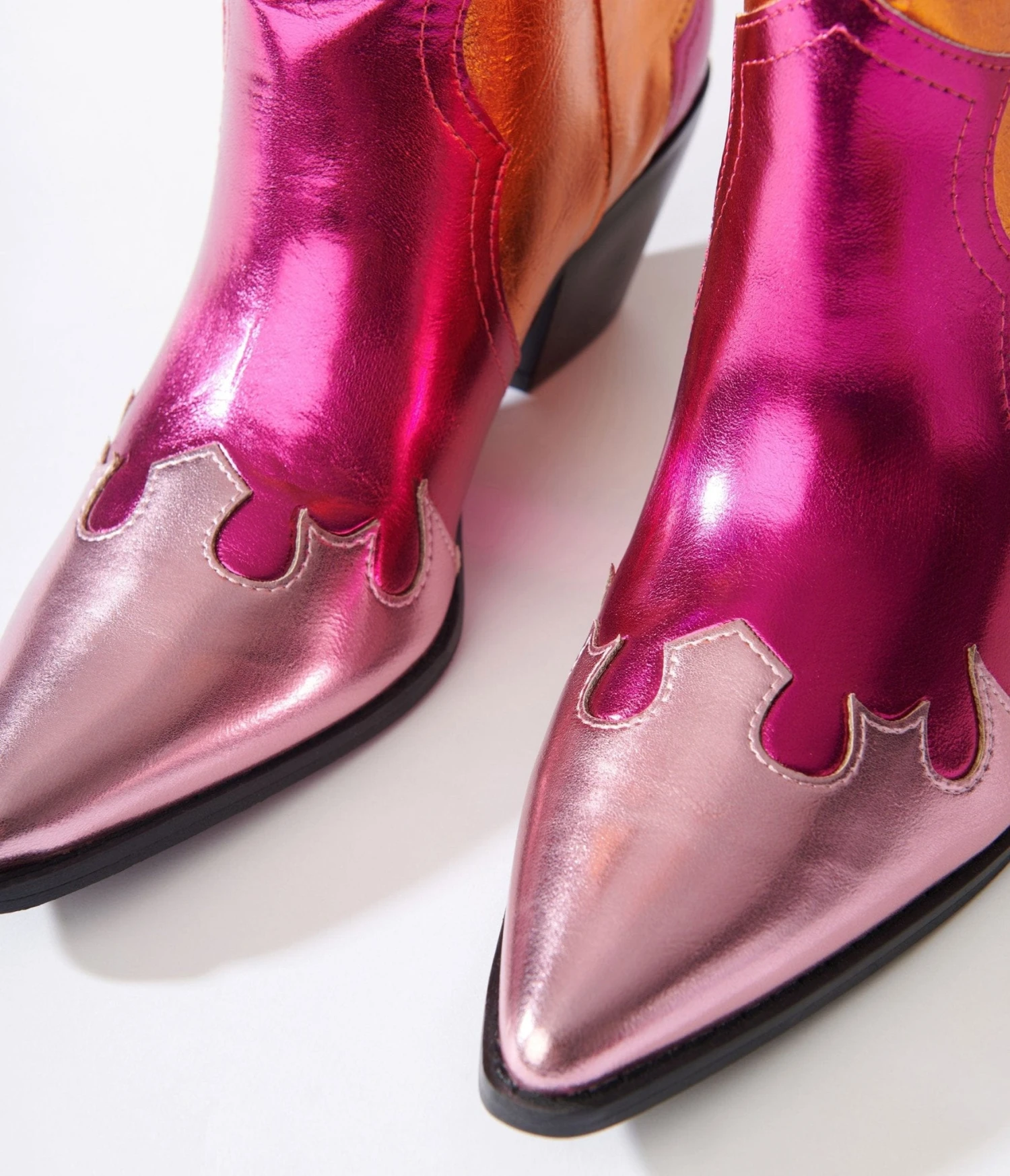 A gleaming set of boots, crafted in pink and orange metallic leatherette that features western inspired accents throughout. Complete with 2 inch heel and cushion insole.