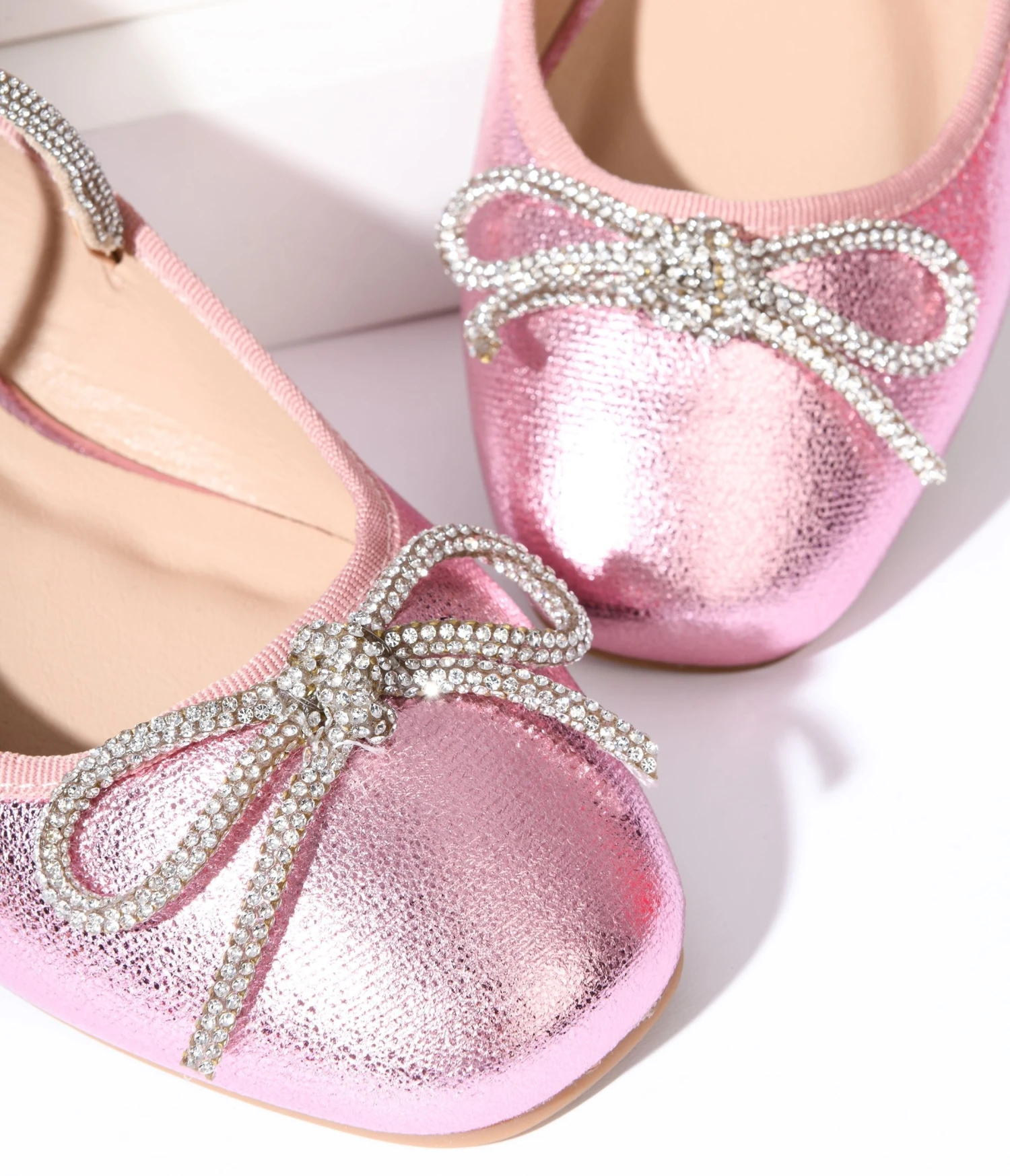 These fabulous shoes are a dazzling combination of metallic pink and leatherette, giving you the perfect blend of style and comfort. The silver rhinestone strap adds an extra touch of glamour, while the silver rhinestone bow tops it all off in the most adorable way. Slip into these flats for a day at work or a night out on the town.