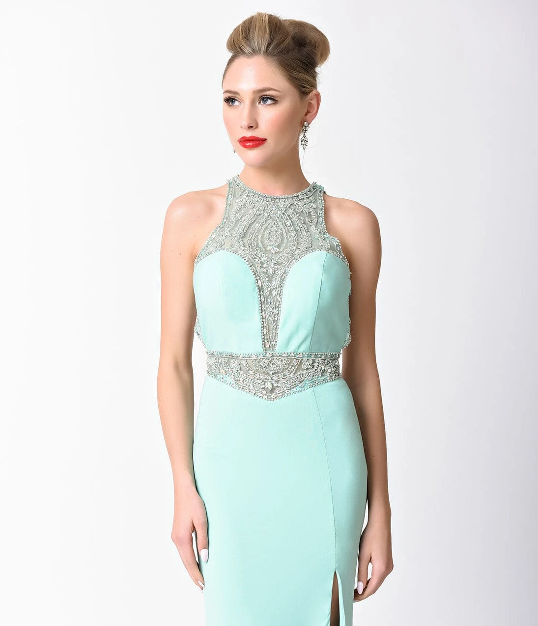 Darling, you will totally break those hearts all over again when you dazzle them in your inauguration to the prom ball while wearing this sexy mint blue gown! A sweeping solid sky blue skirt helps you create a grand entrance and a sexy slit which comes up to the mid thigh will keep you hot, hot, hot! Up at the top, there is a lush jeweled halter bodice with an illusion neckline and built in padding. The embellishments form an impeccable design that will have you feeling like a classic hollywood glam star! The back top has a sexy design to show off some skin and the straps are filled in the shiny embellishments as well! This divine mint blue dress is also available in plus size prom!