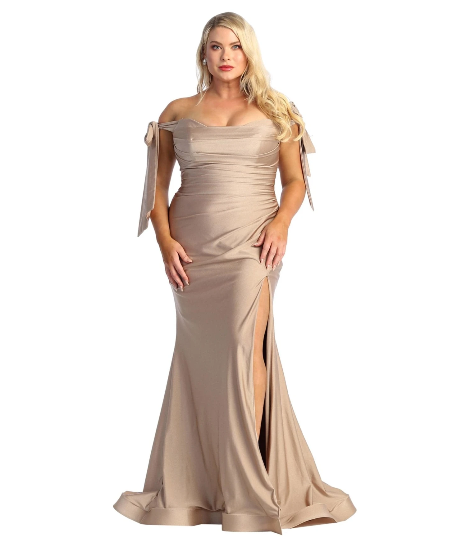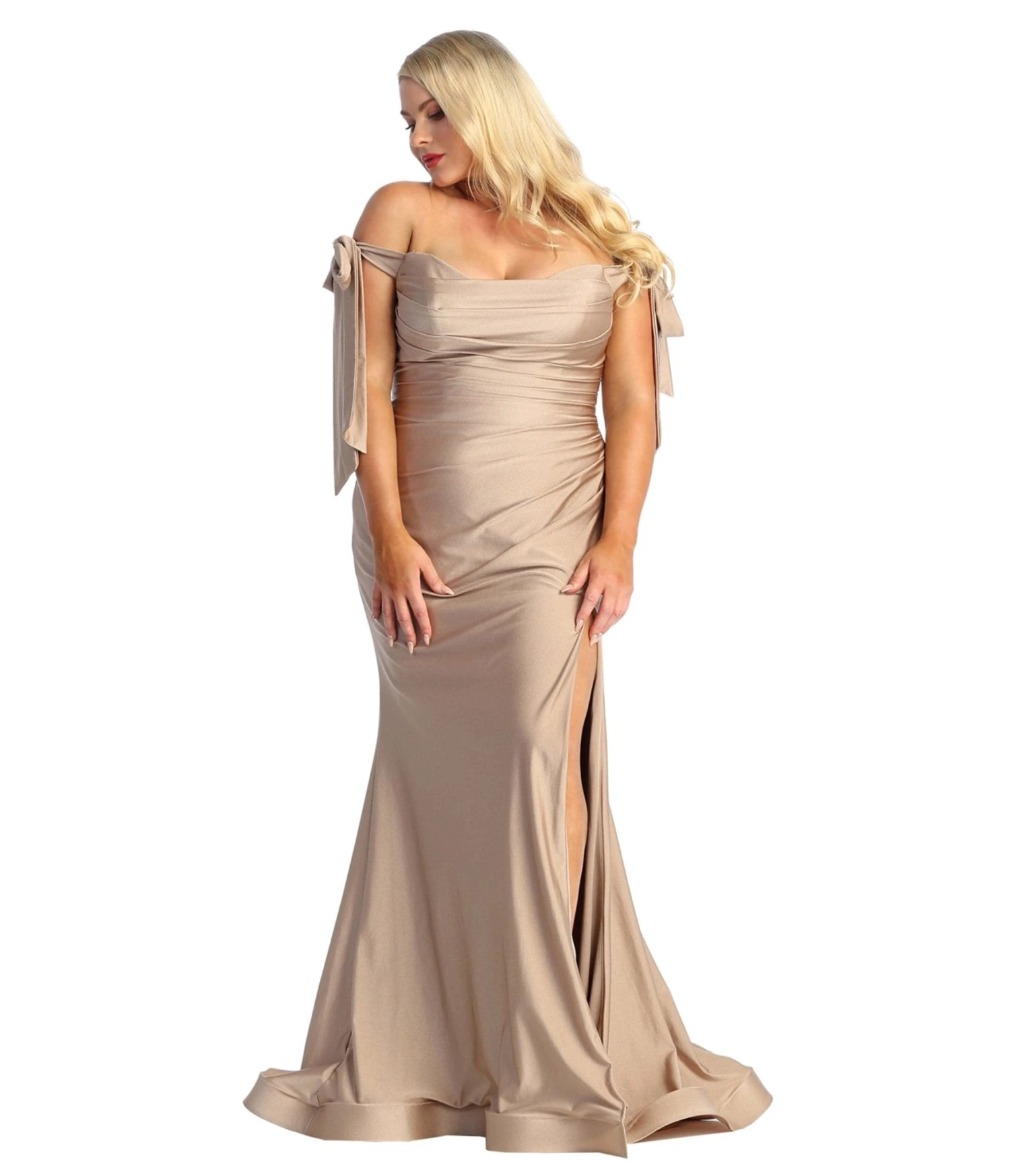 This gorgeous prom gown is crafted in a dazzling mocha satin. The ruched bodice is accented with self tie off the shoulder straps, while the maxi length skirt boasts a short train and sultry side slit. Outfitted with a back zipper!