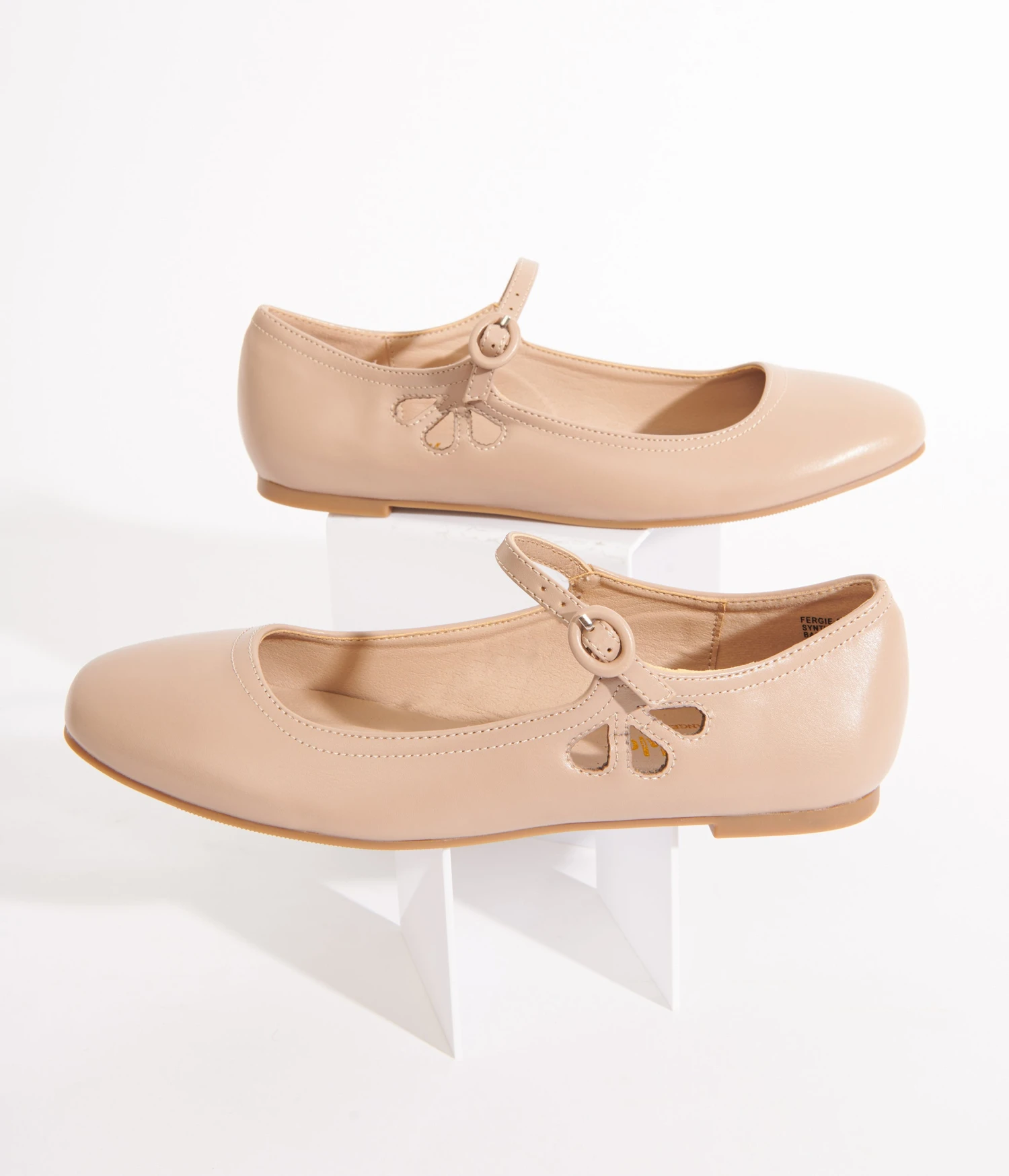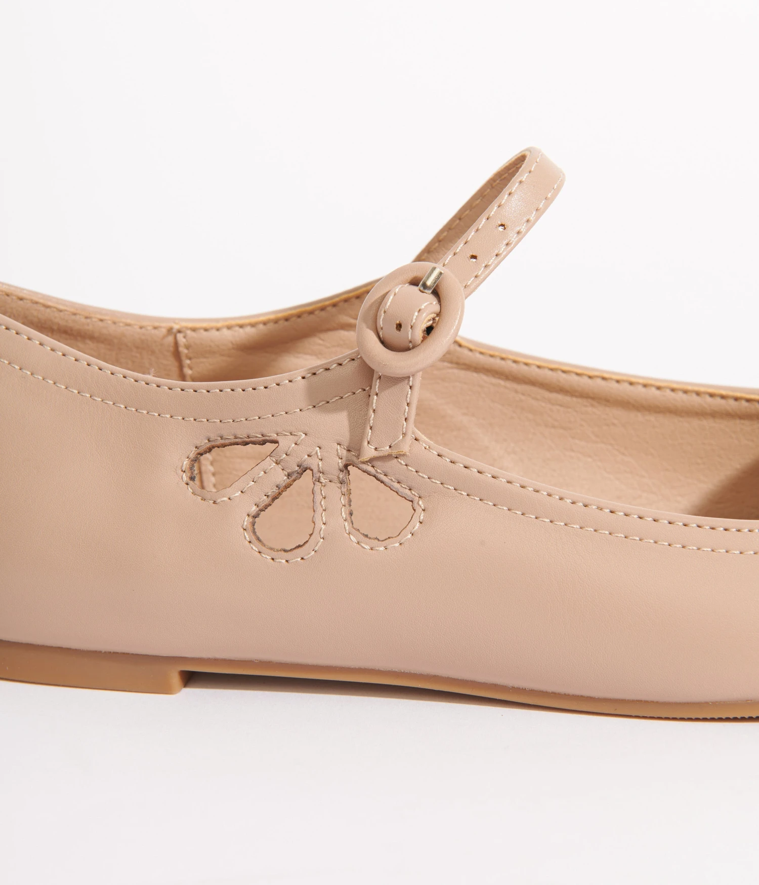 These 1960s style flats capture both vintage charm and modern comfort in one stylish package. The nude color adds a touch of sophistication, making them the perfect versatile addition to any outfit. Crafted from leatherette material, they offer all-day wearability without compromising on quality or style. Thanks to their adjustable buckle strap, finding the perfect fit has never been easier. Plus, the perforated sides add an extra dash of femininity and breathability.