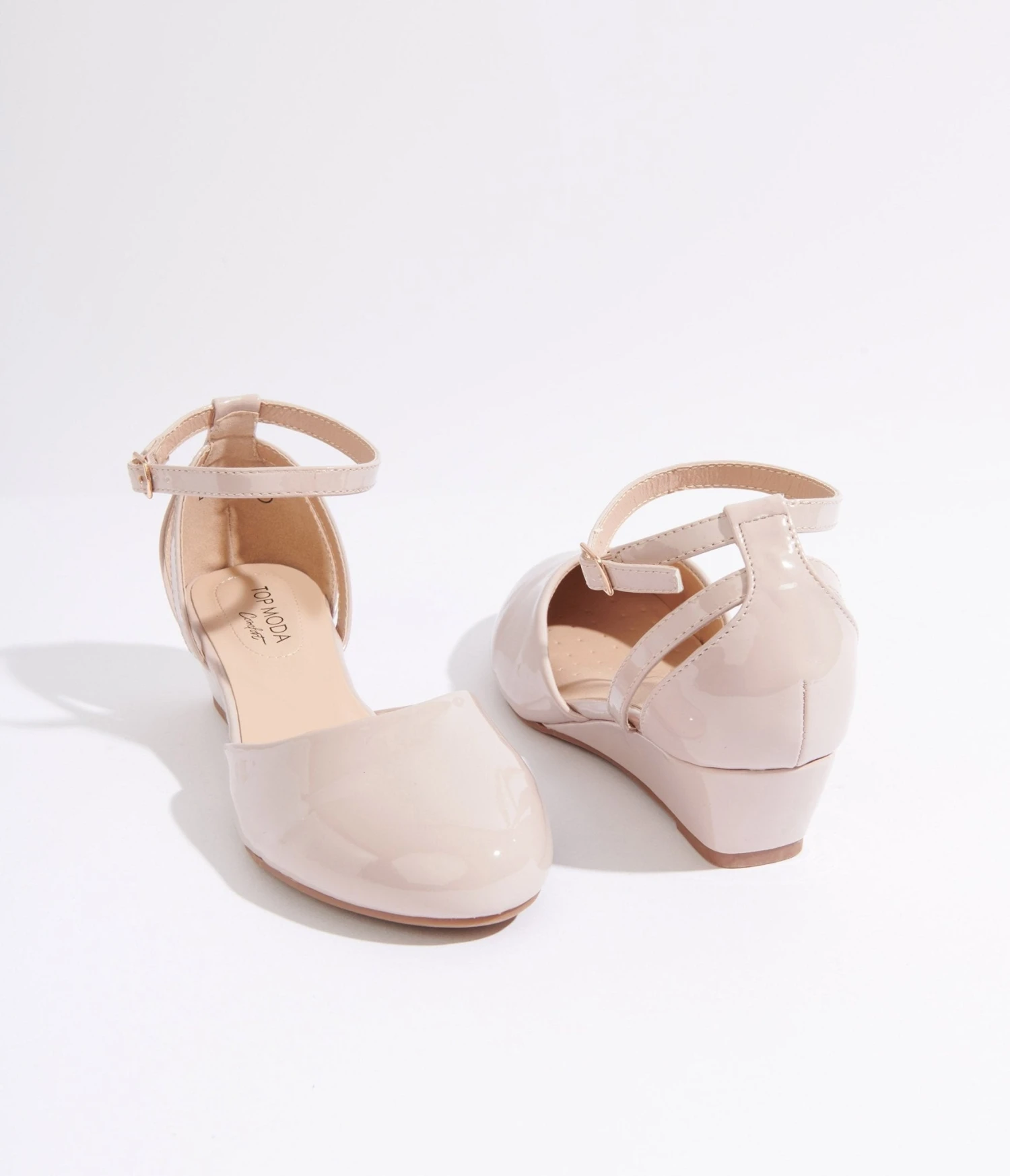 These sweet shoes are crafted in a nude patent leatherette and feature a 1.5 inch wedge heel, and secured with a buckle adjustable ankle strap.