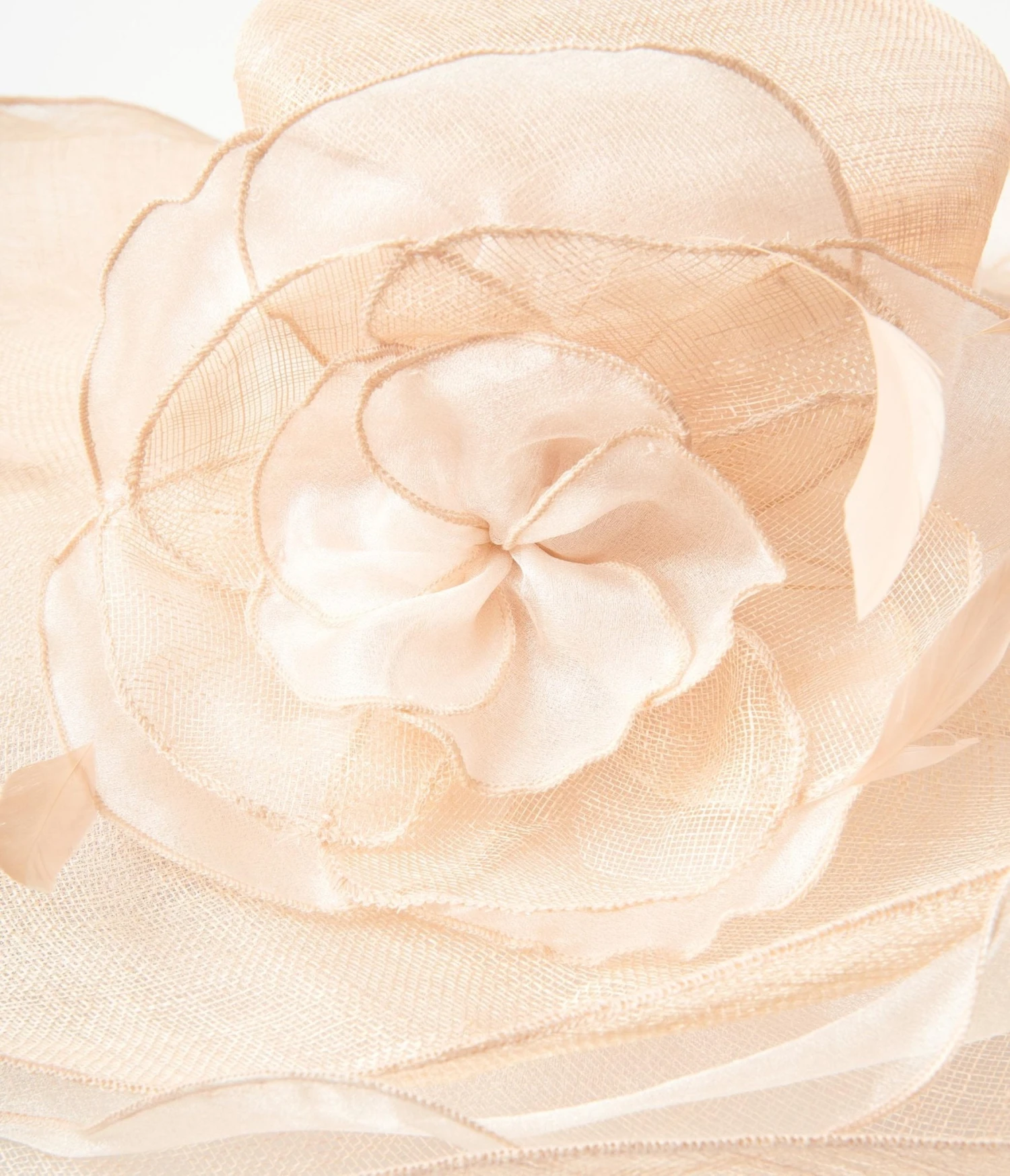 This sophisticated sun hat is crafted in a lovely peach sinamay and features a matching feathered floral ribbon on the hat band. Complete with a layered brim for extra dramatics.