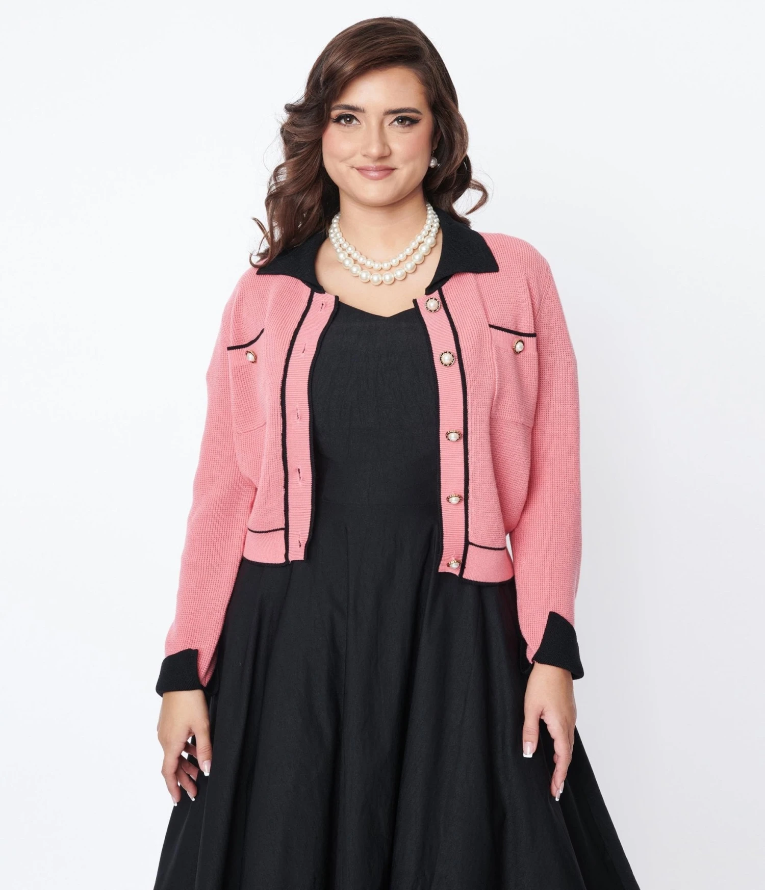 This adorable pink sweater is beautifully adorned with chic black piping, adding a touch of sophistication to your wardrobe. The contrasting black collar adds a playful twist, while the long sleeves feature stylish black contrast cuffs for an extra pop of elegance. It’s even more irresistible with its front button closure featuring faux pearl buttons – talk about timeless charm!