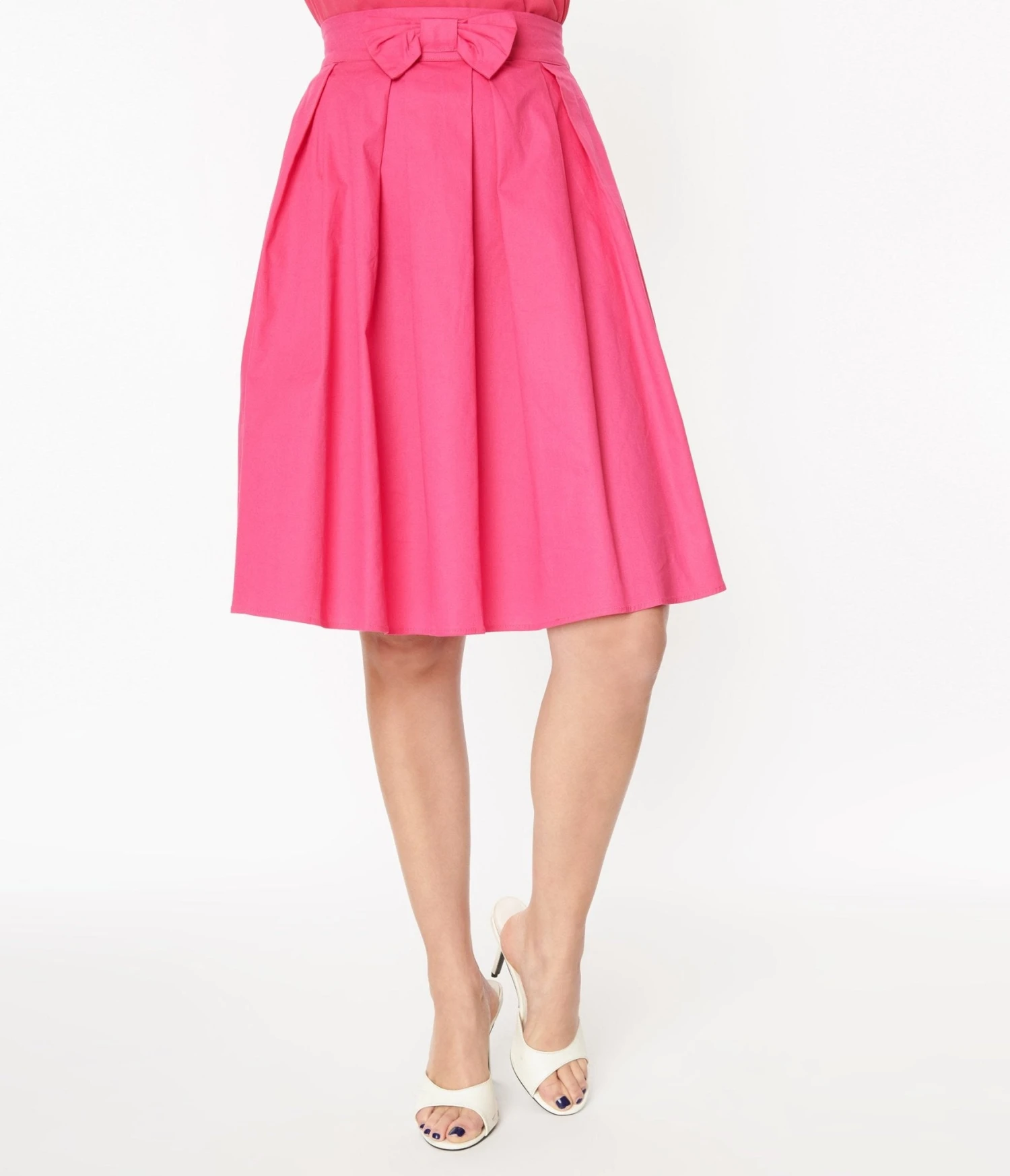 This 1950s style swing skirt is crafted in a pink woven cotton and features a side zipper, side pockets, and attached bow on the waist!
