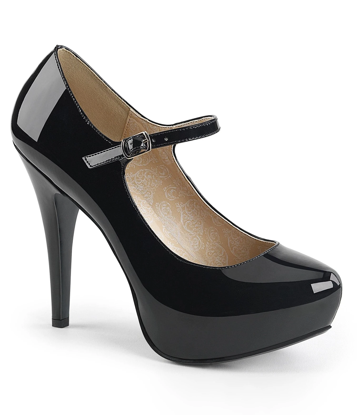 These dazzling Mary Jane pumps are crafted in black patent leatherette. The 1 inch platform and 5 inch heel lend dramatic lift, while the buckle adjustable strap keeps you secure.