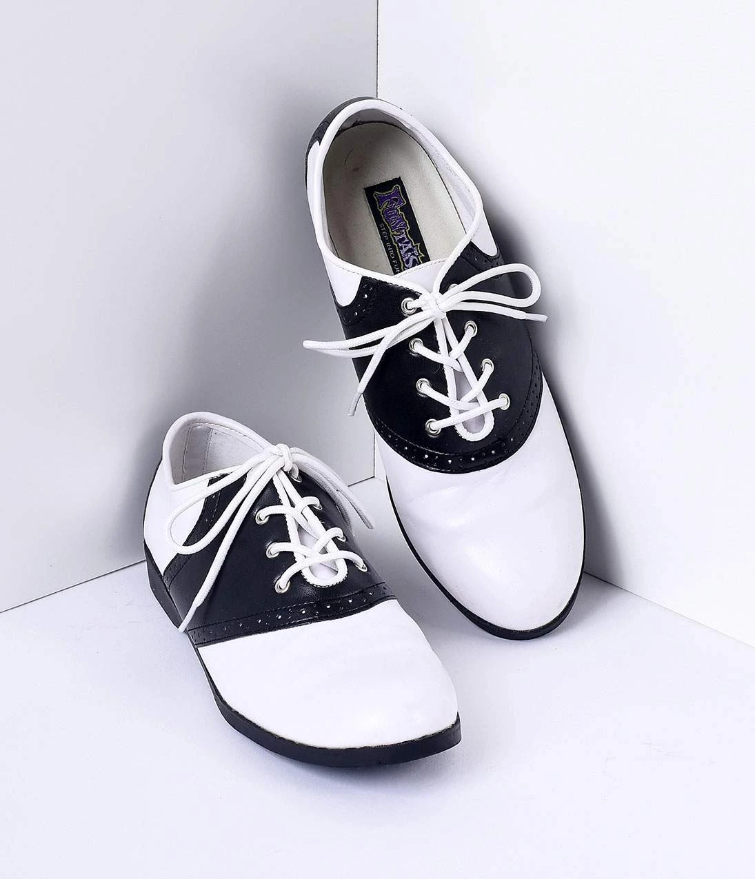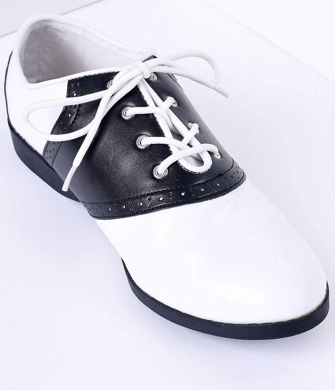 It’s simply textbook, darling! This charming pair of classic saddle shoes are crafted with man-made materials to effortlessly harness retro flair. These endearing two-tone black and white shoes feature perforation details and a white lace-up vamp. Stark white laces complement the white panels on these two-color vintage shoes and stand out against the black lace-up area. Whether you pair them with retro bottoms or dresses, these black and white vintage saddle shoes are ready to add a little class to your outfits!