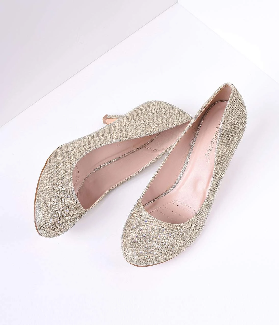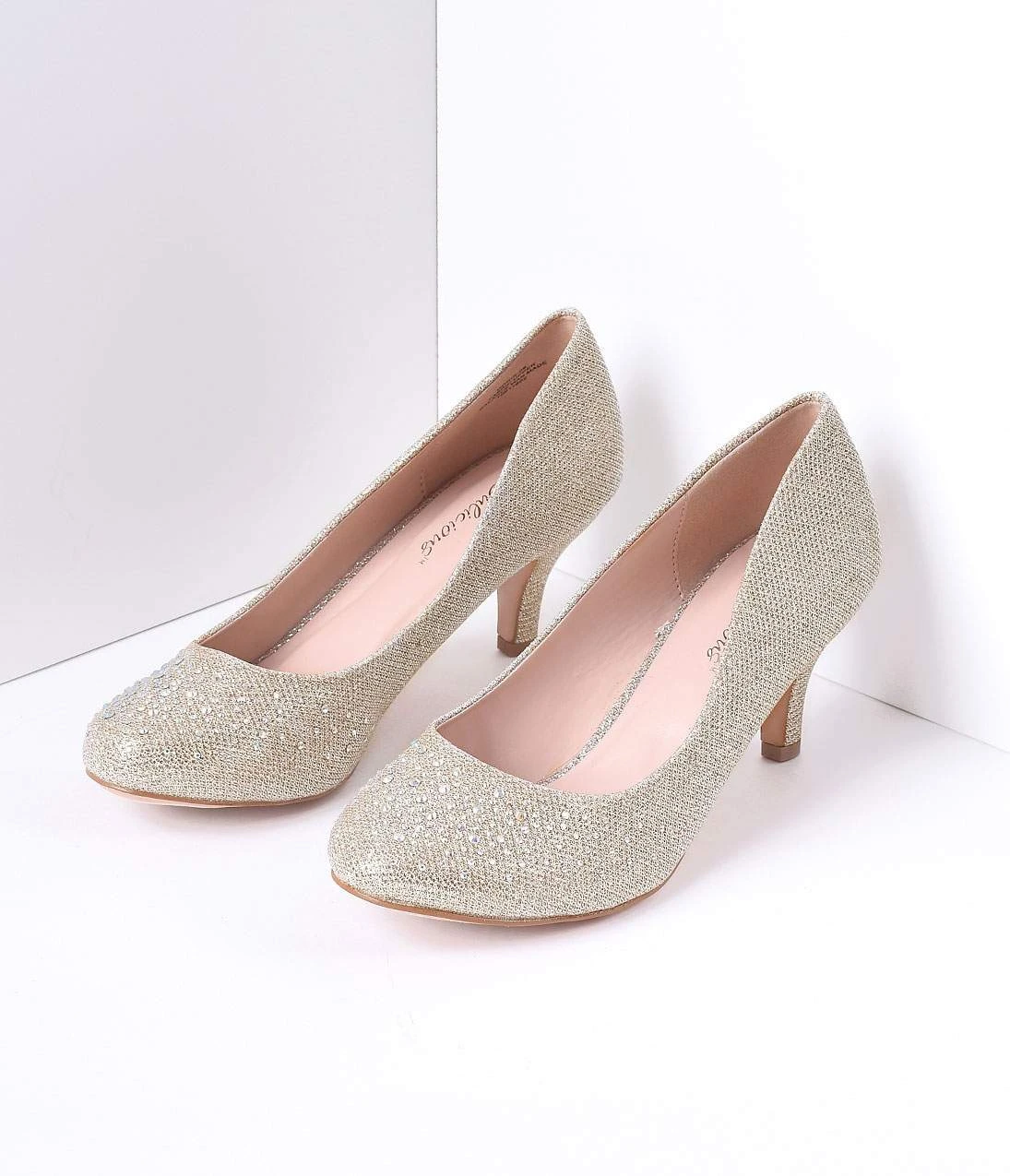 Consider Doris your fairytale footwear, dolls! Sleek and enchanting in a fabulous shimmery rhinestoned champagne, the Doris pumps are a dazzling duo! This polished pair of pumps are sweet and graceful, with a closed toe encrusted in rhinestone detail and cushion insole. Balanced on a 2.5 inch kitten heel and crafted in man-made materials. Step in and swoon!