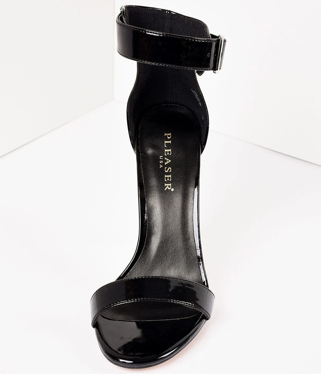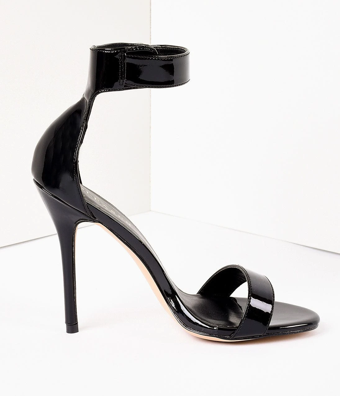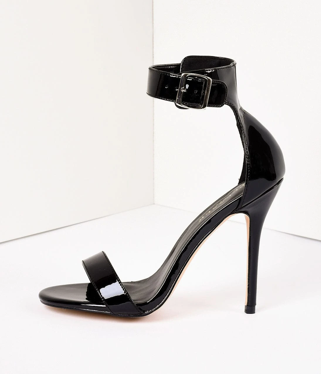 Are you amused, darlings? Presenting a marvelous pair of sky high sandals – endearingly charming black patent ankle strap heels with an adjustable silver buckle. Featuring a man-made patent upper and 5″ stiletto heel. Consider us spellbound!