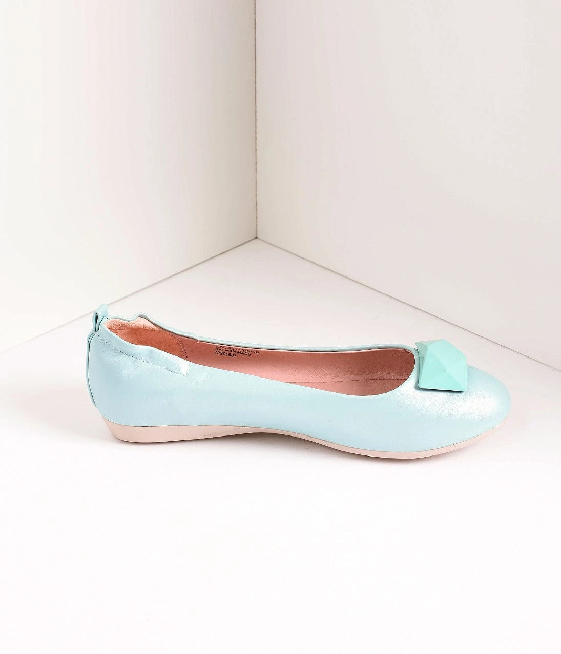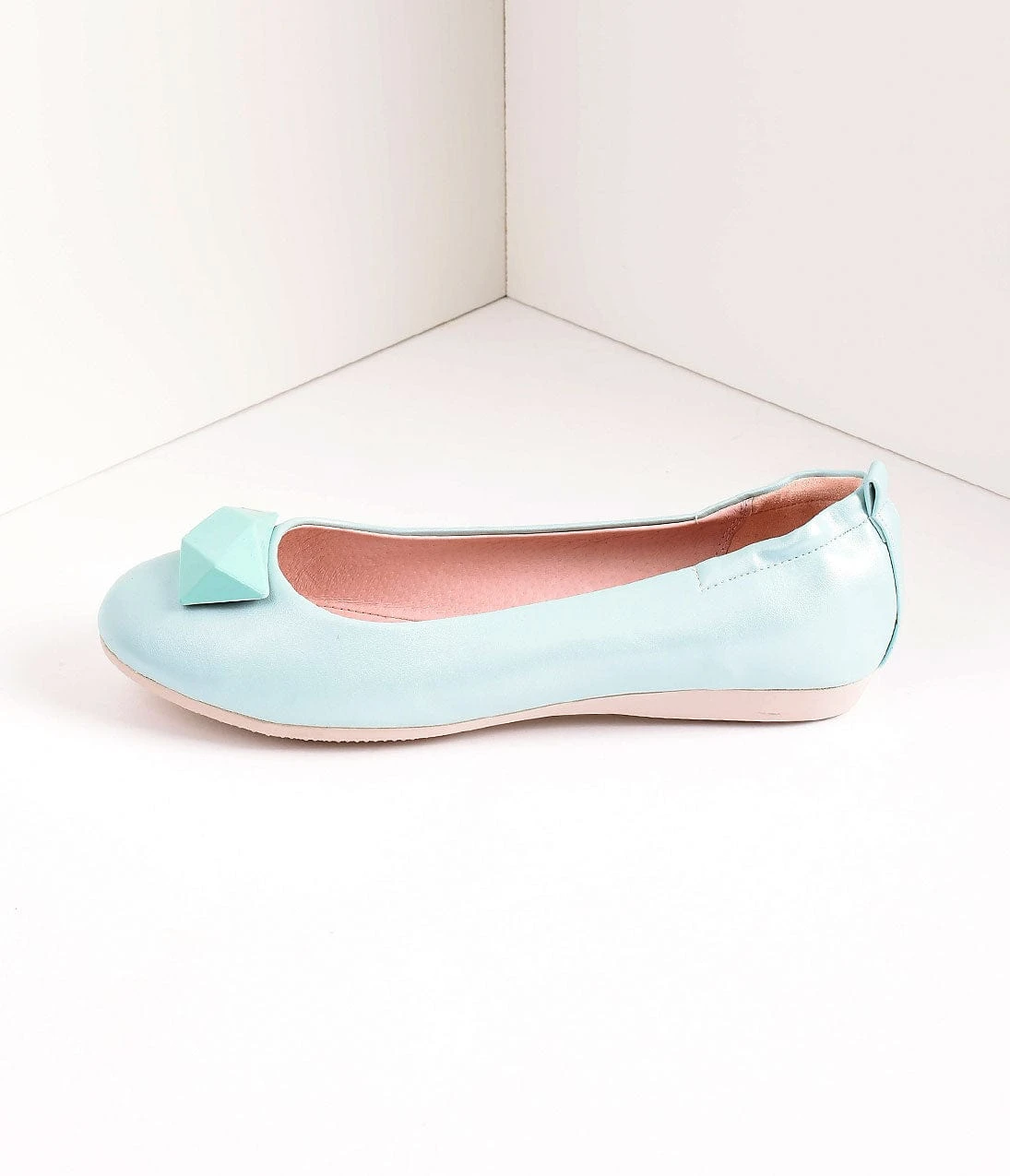 Timeless and charming in aqua blue, these sweet kicks are vintage starlet style personified! Crafted in a foldable ballet silhouette with a gleaming geometric gem on the vamp. Boasting a soft inner sole and rounded toe for the perfect divine duo!