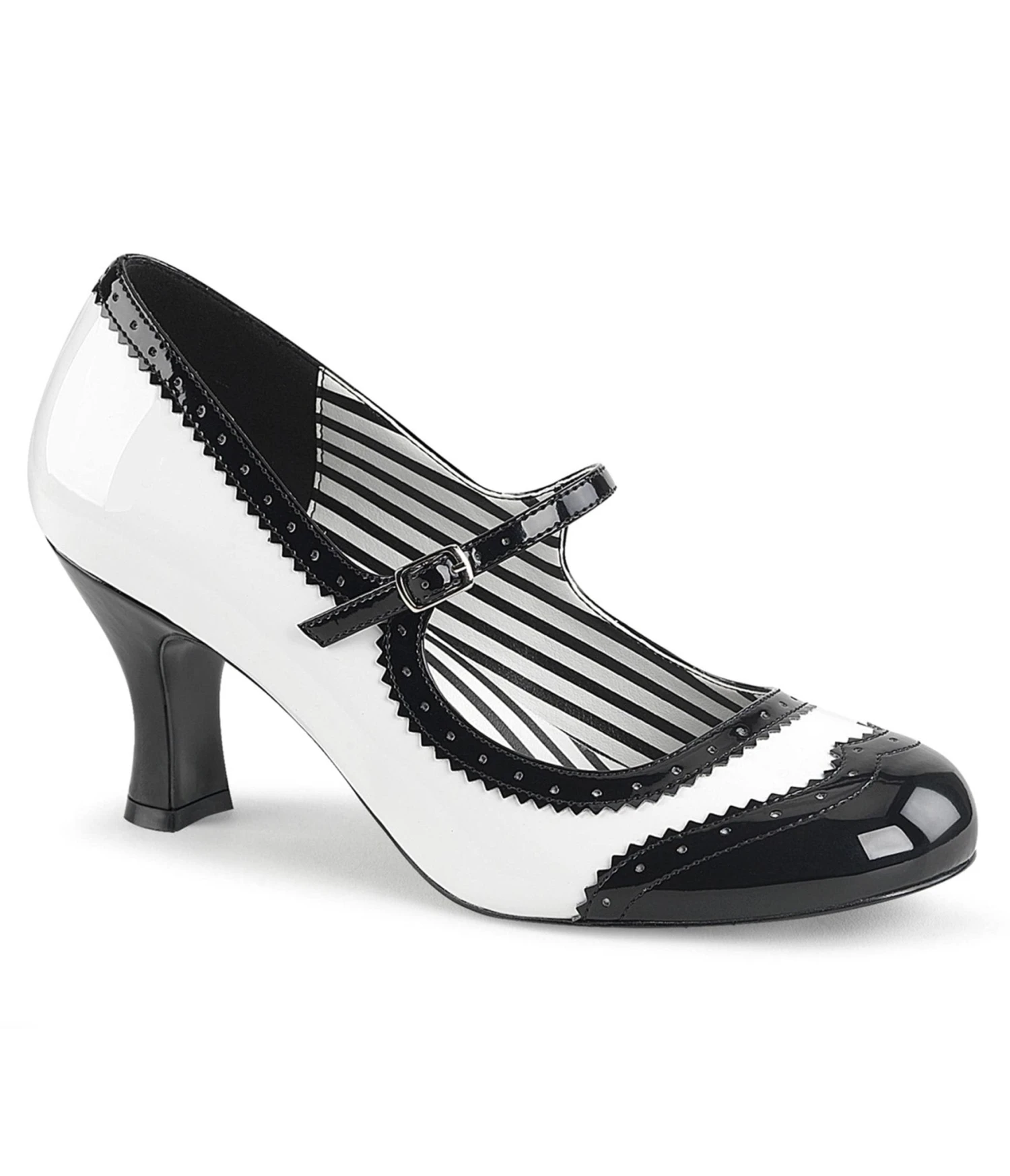 These stylish 1920’s flapper inspired shoes are the perfect footwear for your fun formal occasions! Crafted in a white and black patent leatherette, with a vintage design, these kicks feature a 3 inch heel and adjustable gored strap for a comfortable fit.