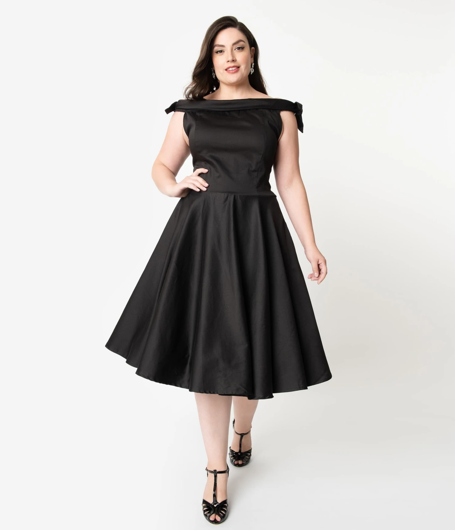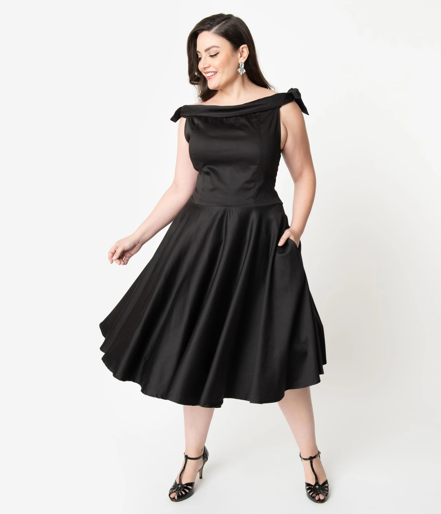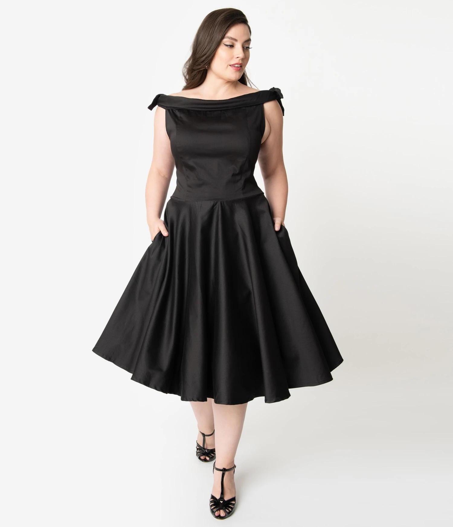 Pearls and diamonds, please! A glamorous plus size black dress in vintage styling, the Mona Dress is a glamorous frock in a marvelous cotton blend. The princess seamed bodice boasts a dramatic off the shoulder fold over neckline that secures with an elastic band and is embellished with darling self tie shoulder bows. The seamed waist tops a sweeping swing skirt, outfitted with side pockets, and cascading to a straight hem at the knee. Complete with a back zipper, it’s a vintage dream!
