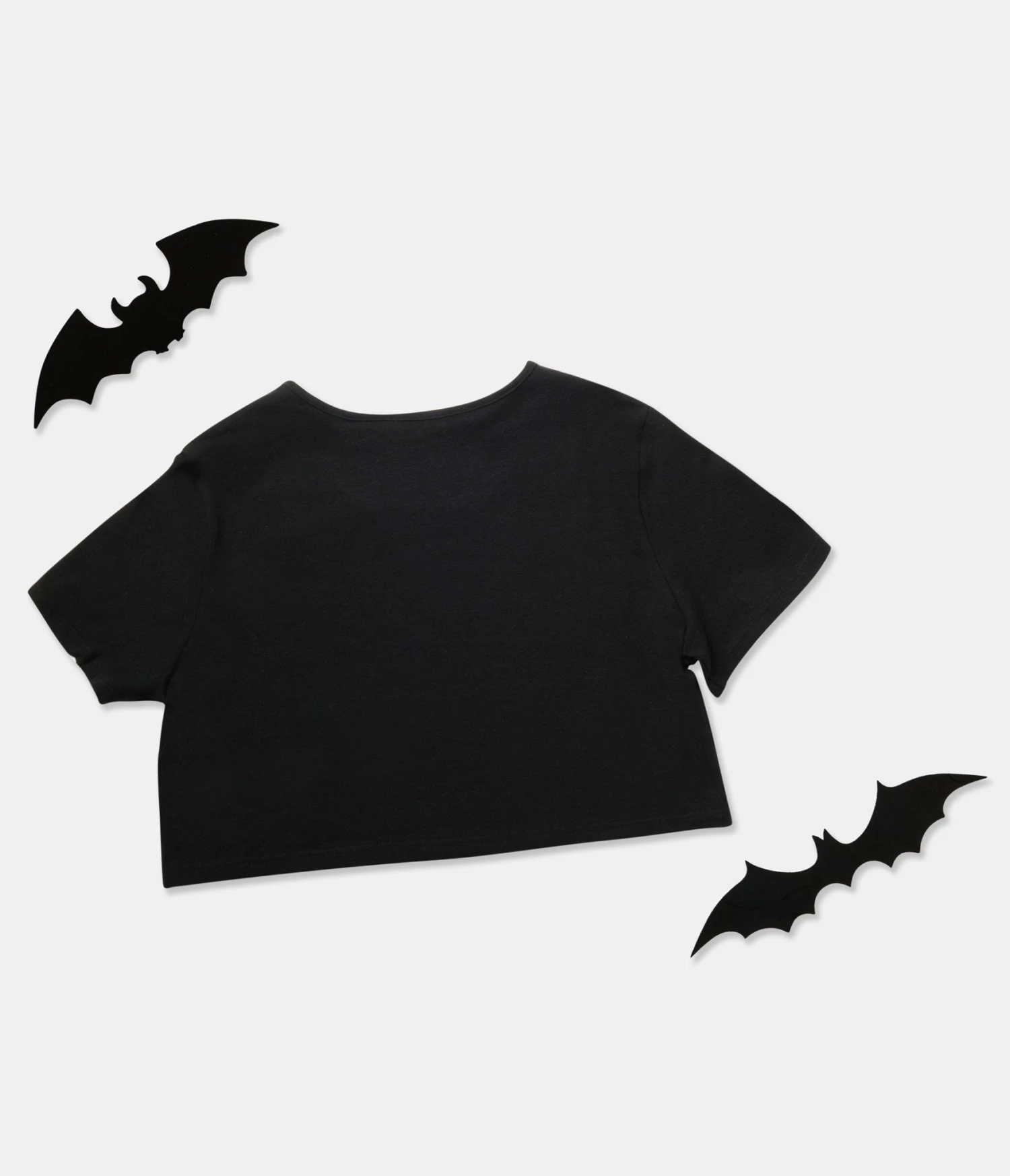 This crop top is crafted in black cotton and features a mesh bat shaped cutout on the bodice front. Complete with short sleeves and cropped length for a spooky classic silhouette!