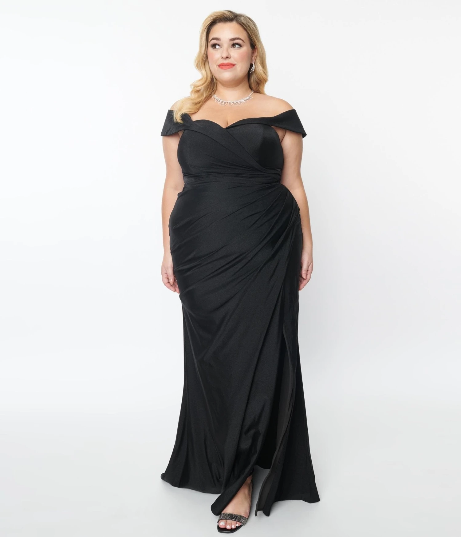 This gorgeous plus size black gown boasts a sultry off the shoulder design. The sweetheart neckline tops the princess seamed and padded bodice while the sweeping long skirt features a faux wrap design and sultry side slit. Outfitted with a back zipper!