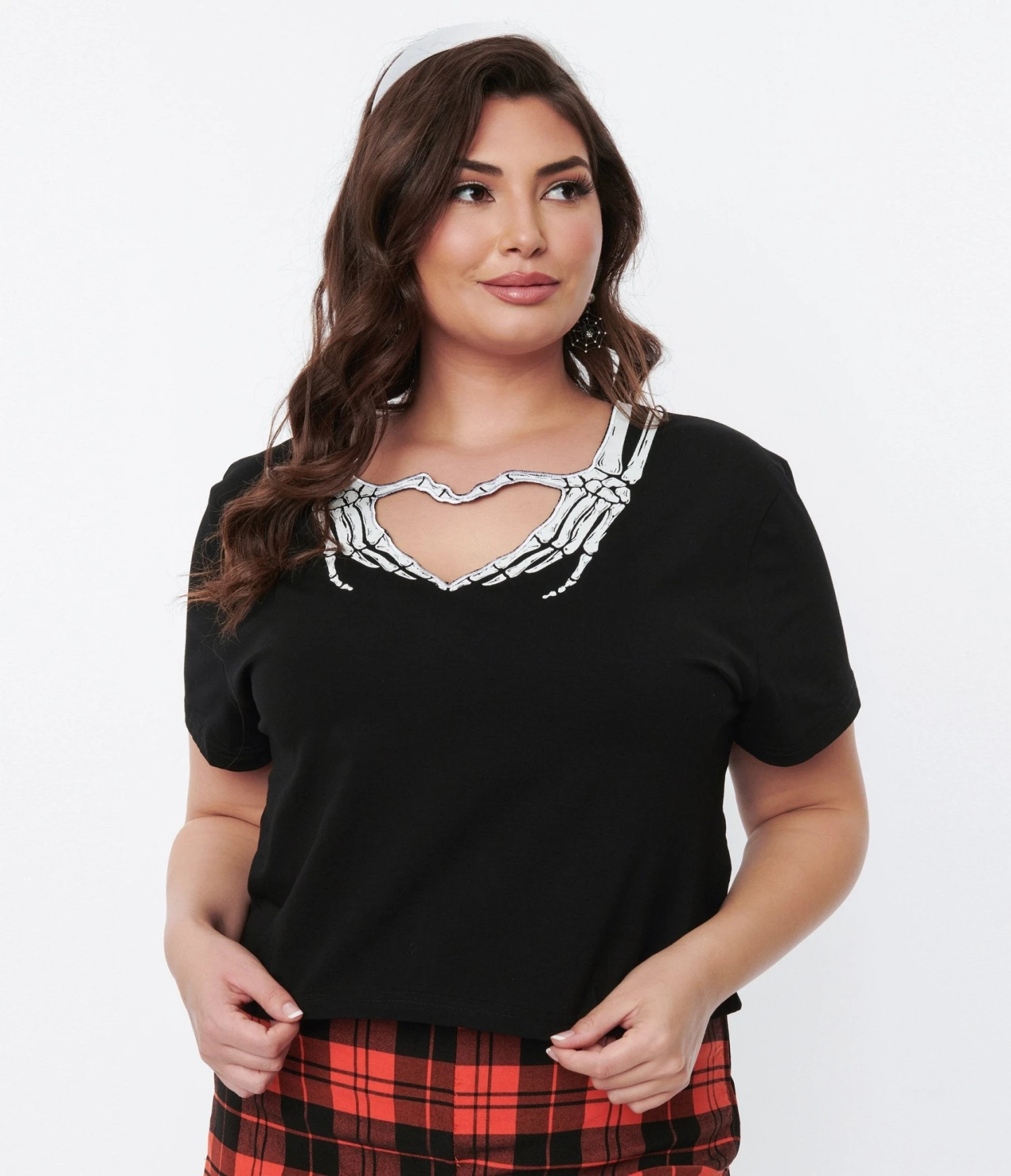 Scary spooky skeletons need love too! This gorgeous plus size separate is crafted in a cotton knit to hug your curves for a drop dead silhouette. Set in a black , the stunning heart shaped keyhole design is framed by a graphic of white skeleton hands to create a sweetheart neckline that flatters your visage. Complete with short sleeves for a spooky classic silhouette!