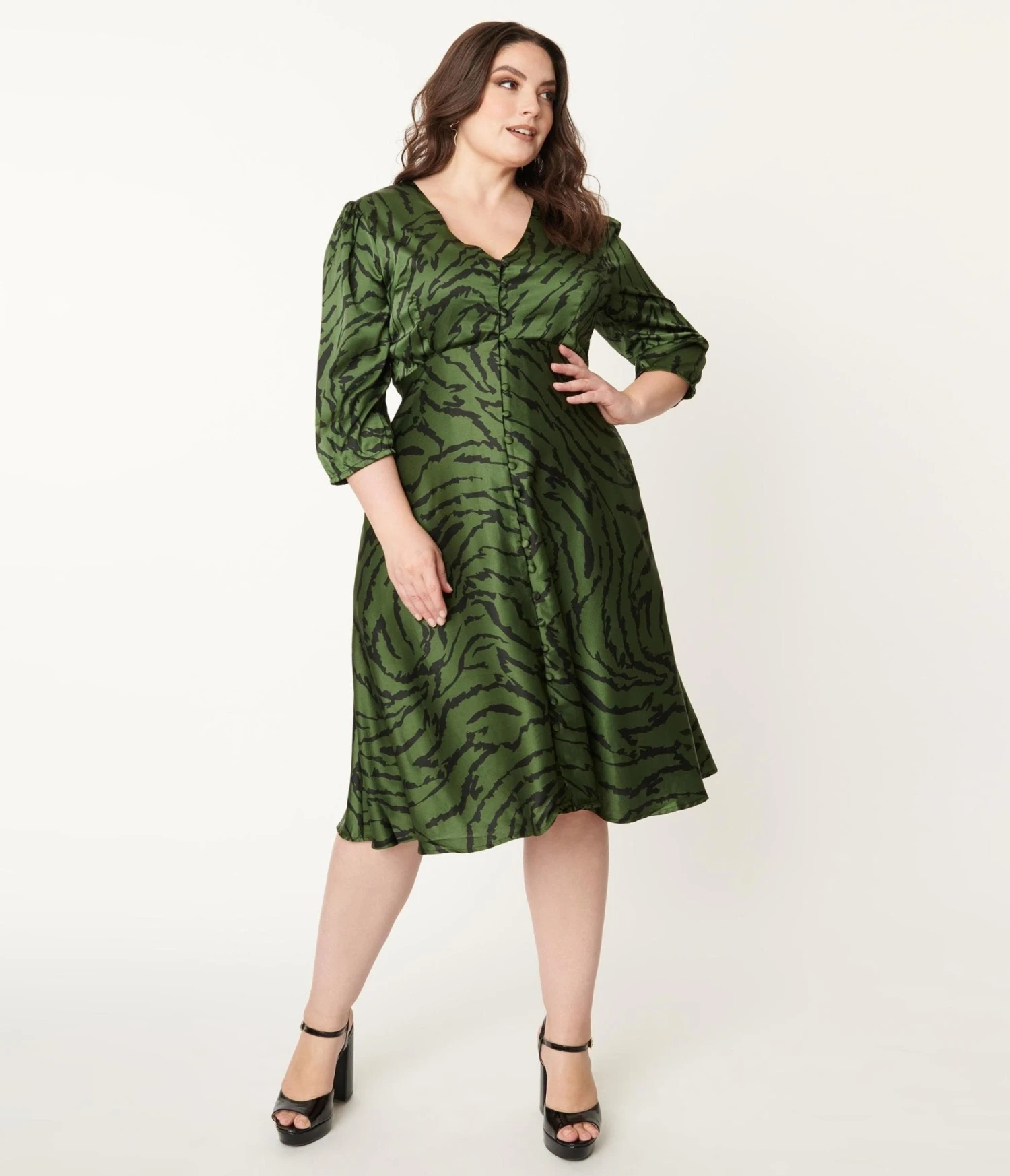 It’s your time to shine, dolls! An eye-catching plus size silhouette full of vintage vibes, this sweet swing is crafted in a satin-like fabric that dances with black zebra-style stripes printed throughout the emerald green backdrop. The button up front leads to a V-neckline, framed by three-quarter length sleeves that drop into elastic cuffs. The seamed waist is cinched centers your figure as the sweeping swing skirt is outfitted with side pockets for frolicking function!