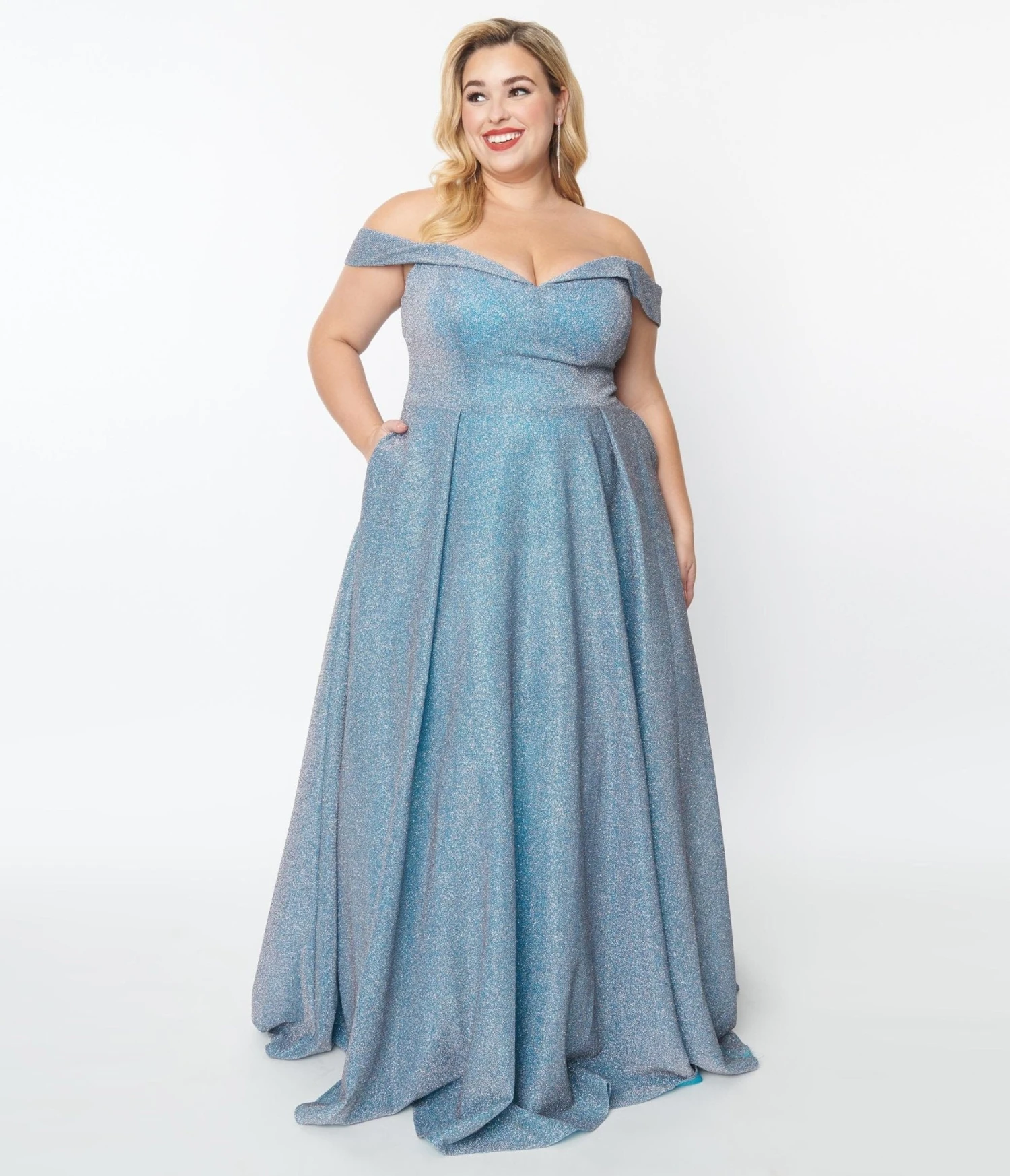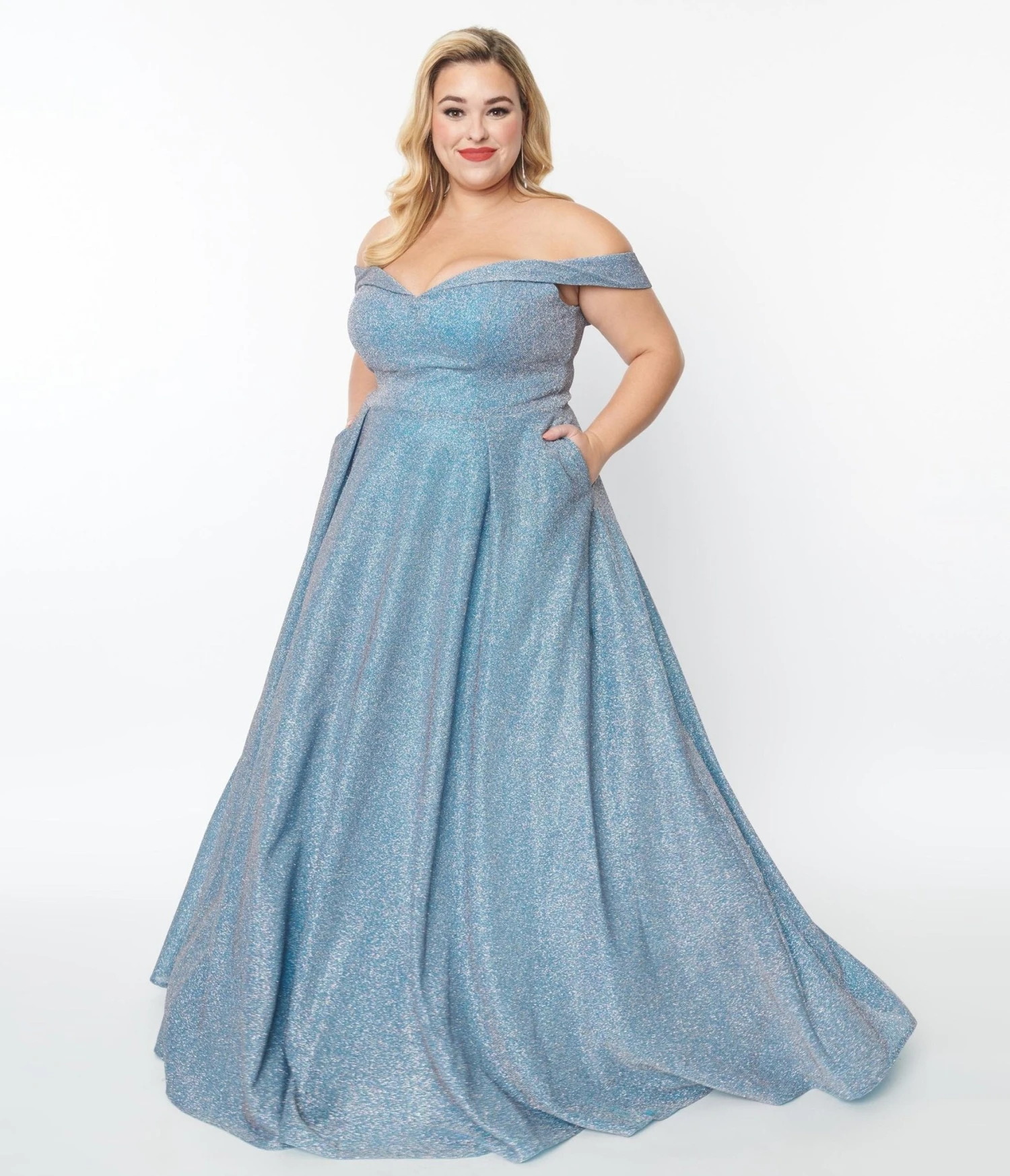 Radiating with glittering light blue fabric, this gown charms an off shoulder sweetheart neckline with a draping fold over accent. The skirt reveals an A-line silhouette with fabulous box pleats that runs to full length hem. Side pockets and sweeping train add a perfect finishing touch to this beauty.