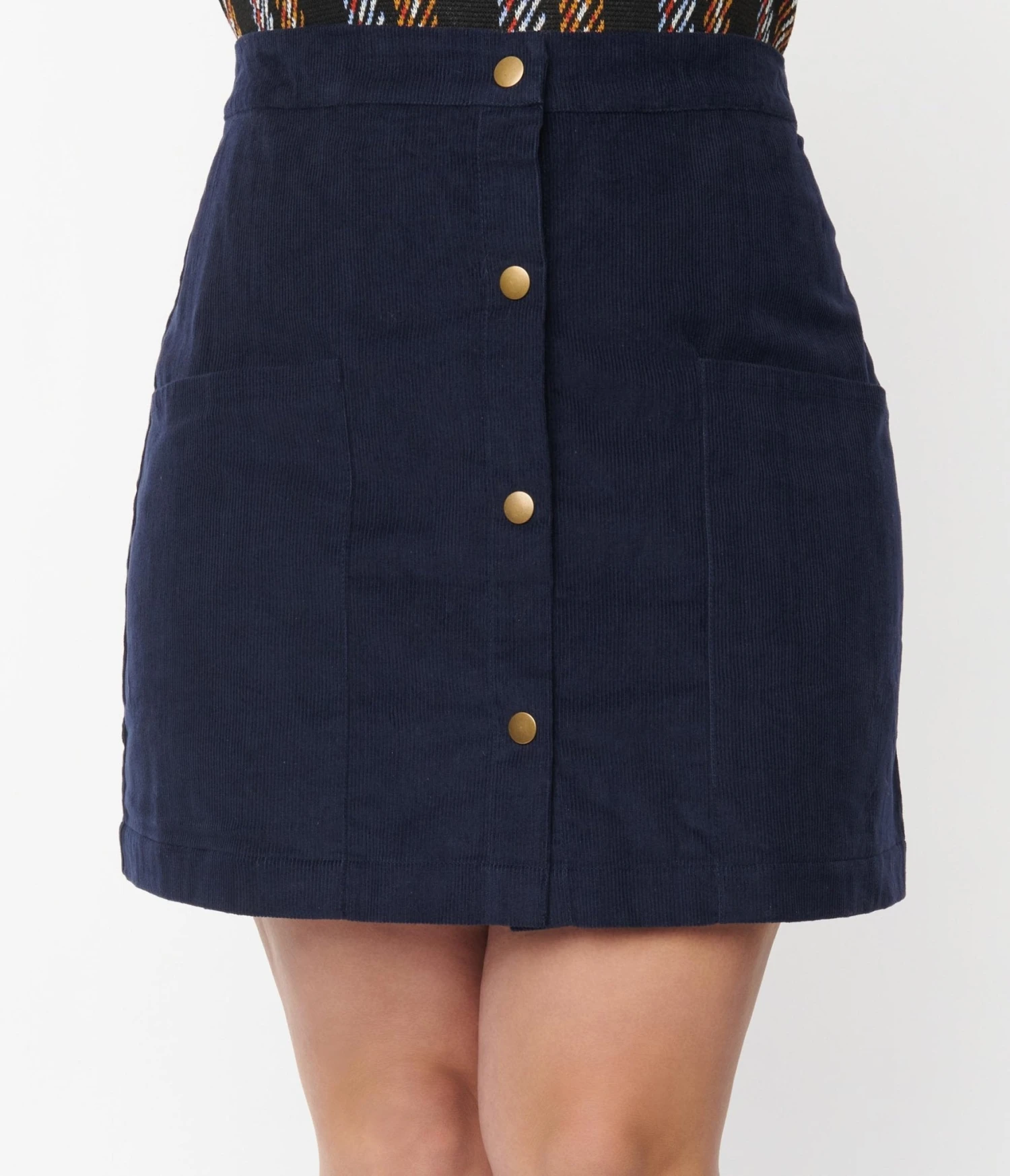 This charming retro 1970’s mini skirt is crafted in a lovely navy corduroy. Outfitted with a button up front and deep front pockets.