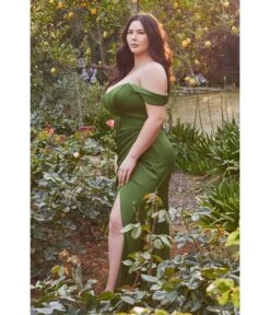Cinderella Divine Plus Size Olive Divine Satin Corset Off-Shoulder Prom Dress