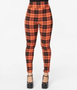 Unique Vintage Plus Size Orange Windowpane High Waist Ginger Pants