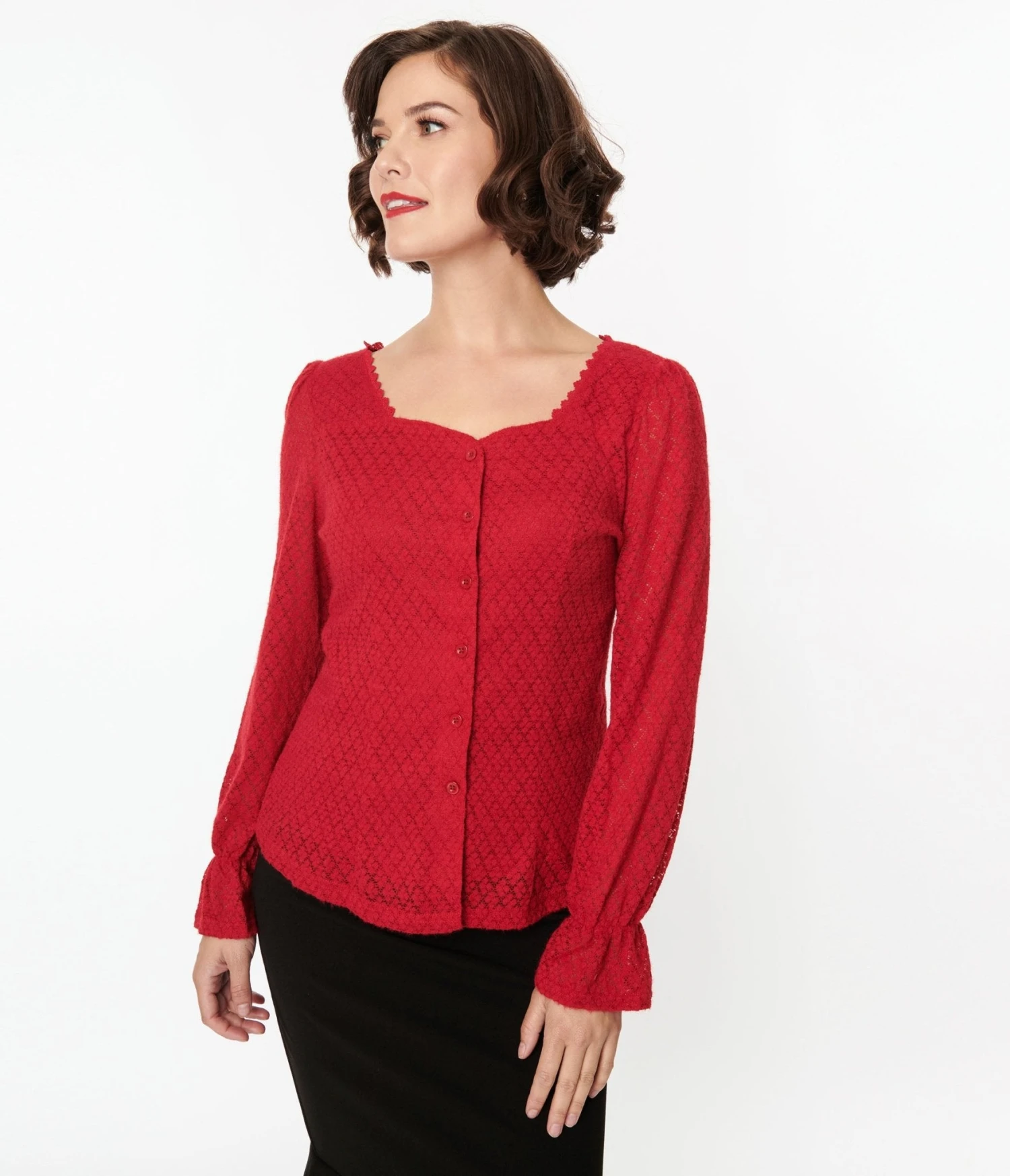 This darling cardigan is crafted in a bright red knit featuring a perforated diamond design throughout. Complete with lightweight lining, long sleeves, and button front!