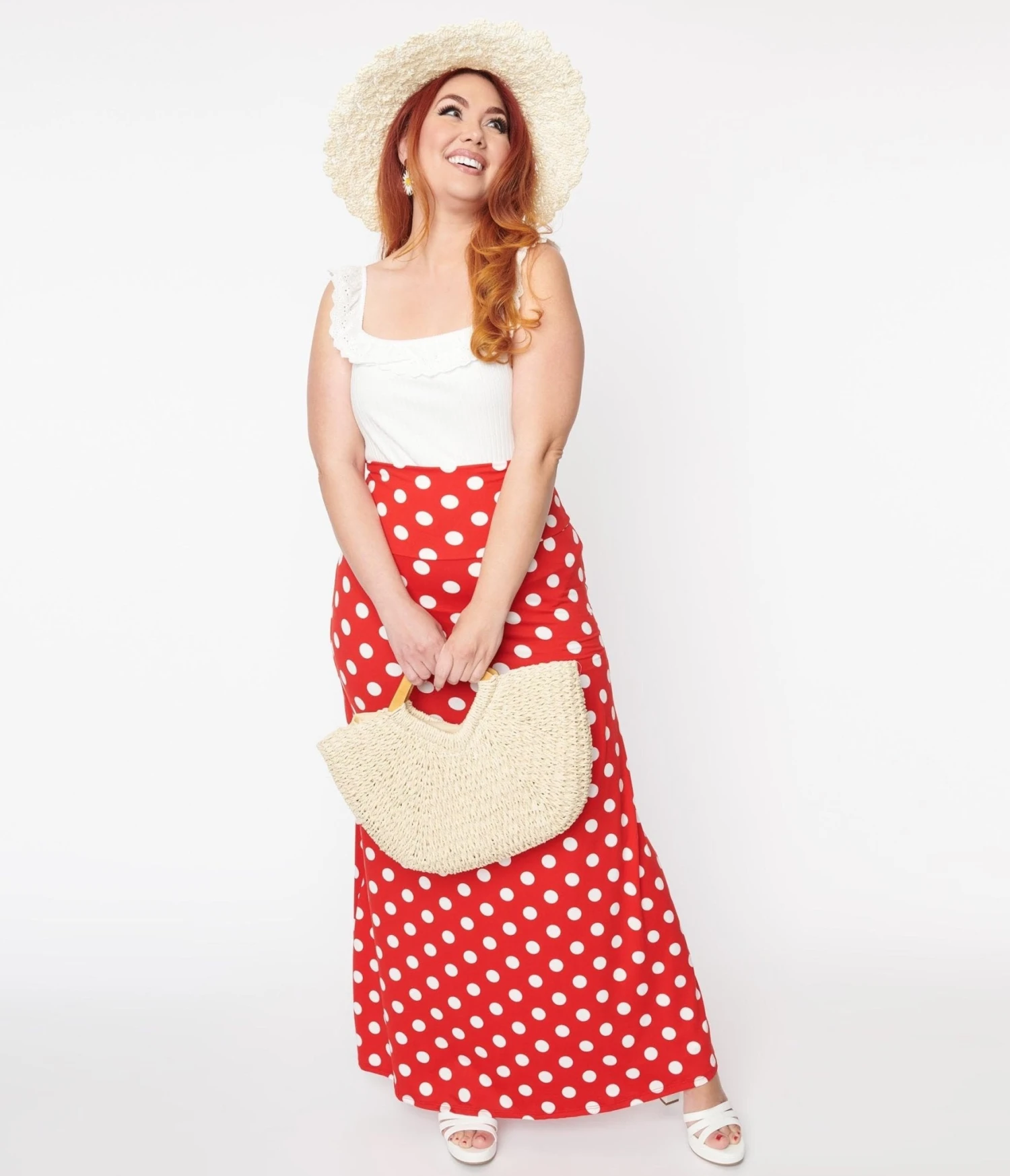 This adorable maxi skirt is crafted in a red knit featuring white polka dots throughout. The foldable waistband allows for a customizable fit and added comfort, while the floor-length silhouette creates a classic look.