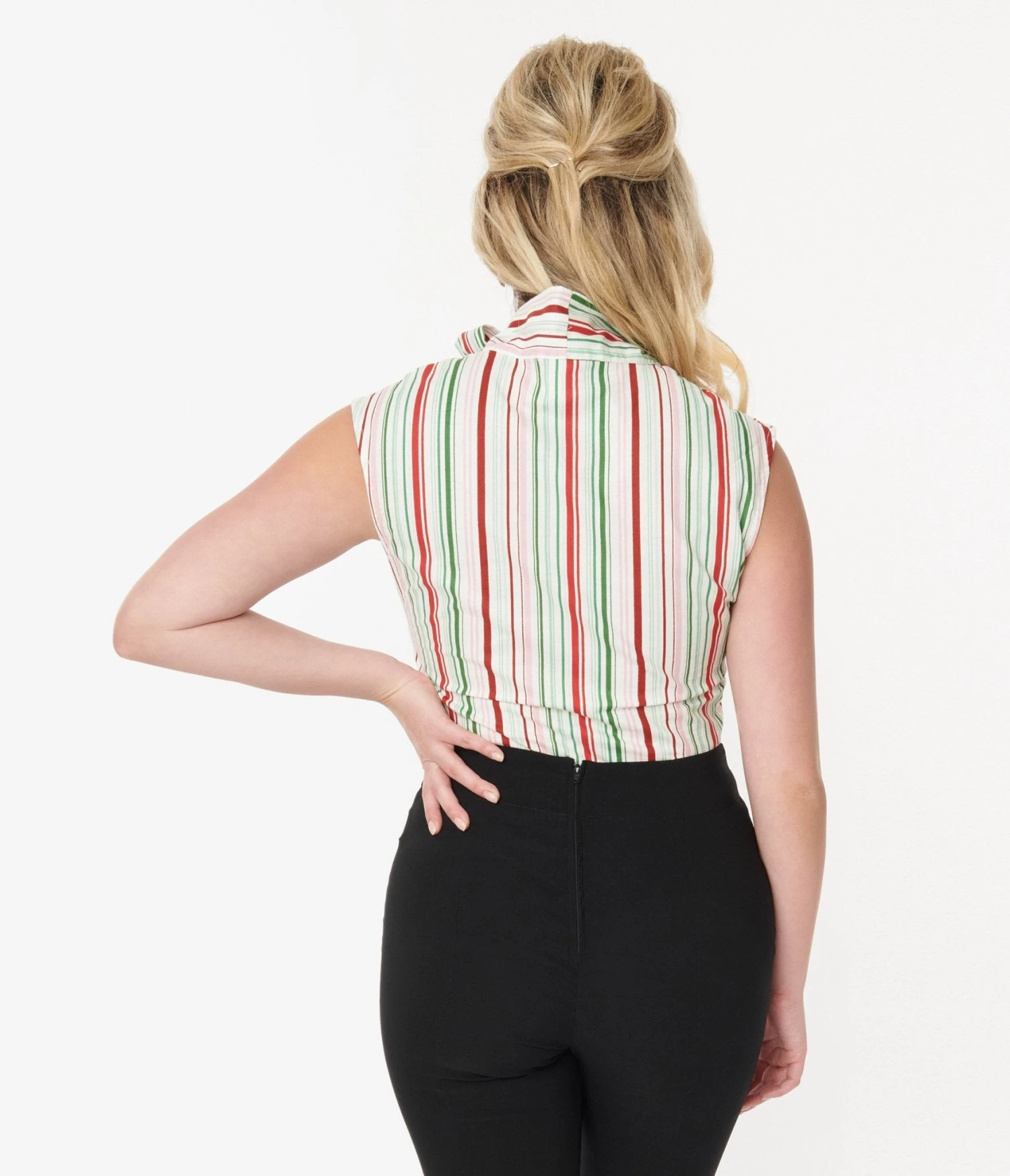 This sleeveless woven top from Retrolicious features a fun candy cane striped print in shades of white, red, and green. With its side zipper and self-tie bow keyhole neckline, this top guarantees a perfect fit while exuding some serious retro vibes.