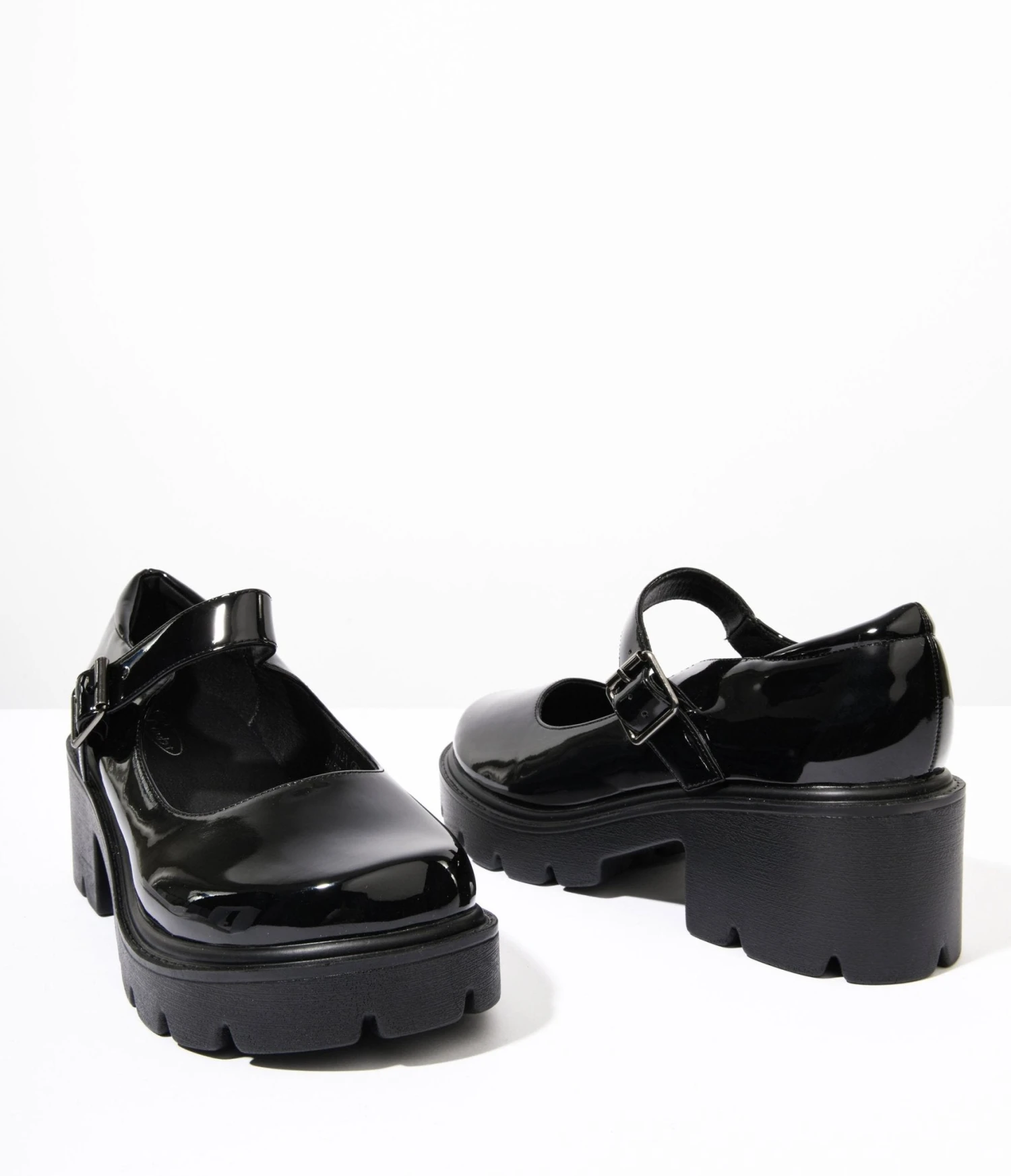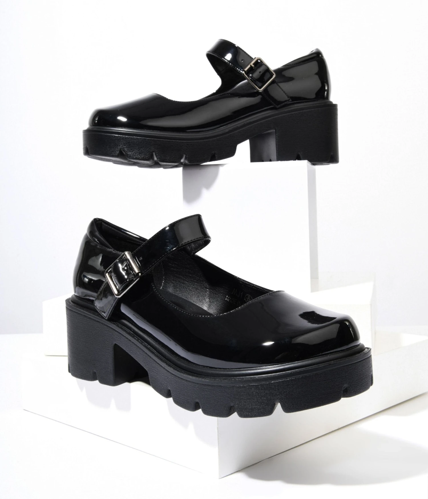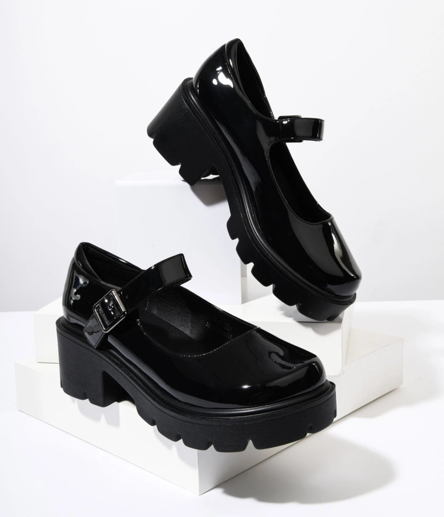 Get ready to turn heads and make a fierce fashion statement with these black patent leatherette chunky Mary Jane heels! Complete with an adjustable strap, closed round toe, 1 inch platform, and 2.5 inch heels.