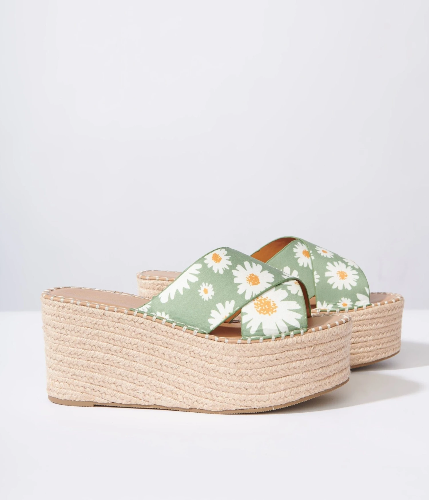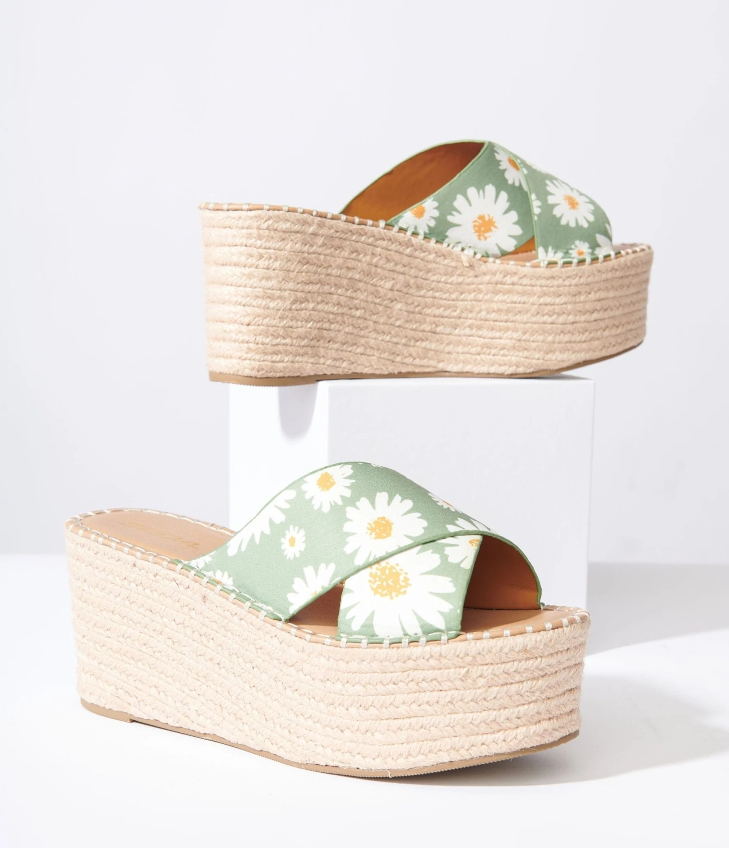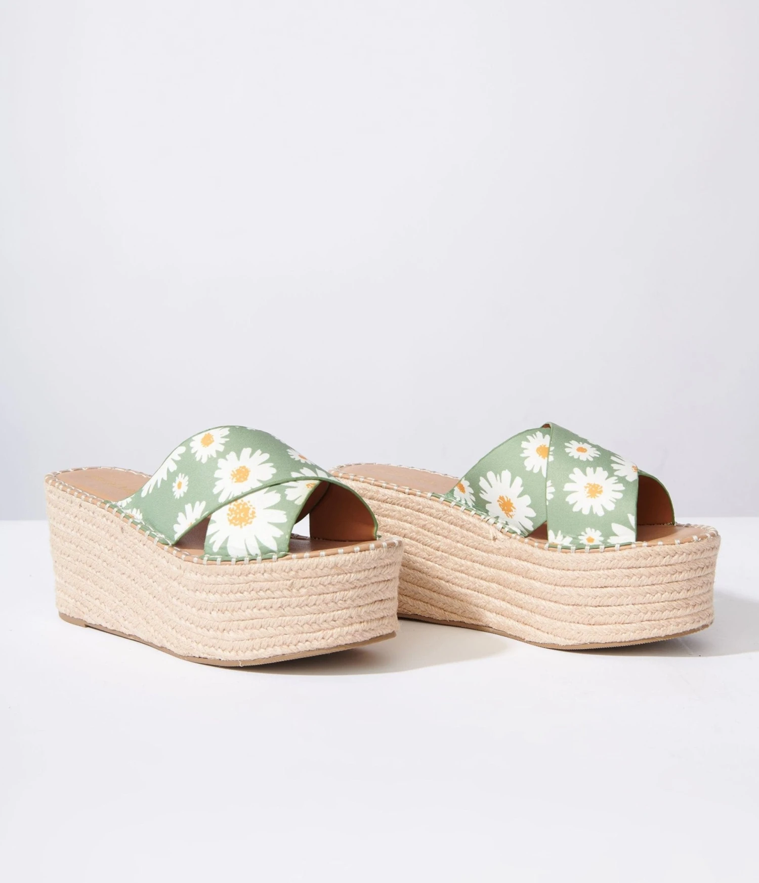 Criss cross strapped sage green leatherette 1970’s style sandals with white daisies throughout. Complete with a 2 inch straw braided platform and 3.5 inch heel.