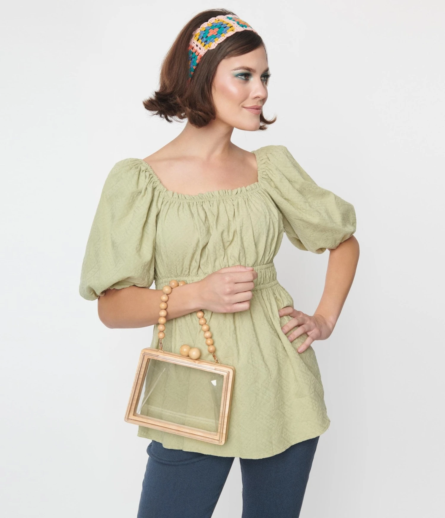 This adorable babydoll blouse is crafted in a textured sage green woven. Outfitted with an elastic waist and short elastic puff sleeves. Complete with a ruffled elastic scoop neckline.