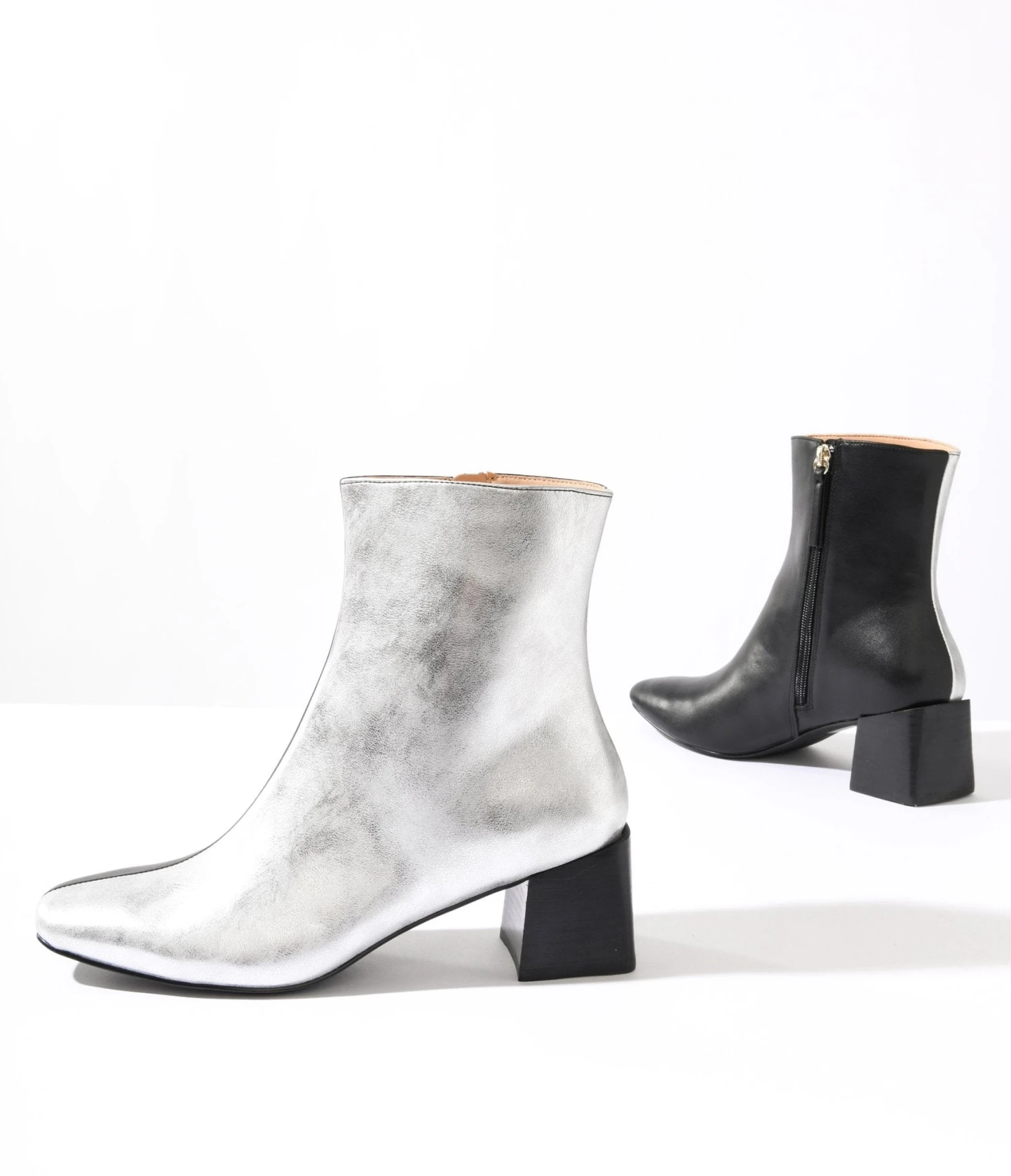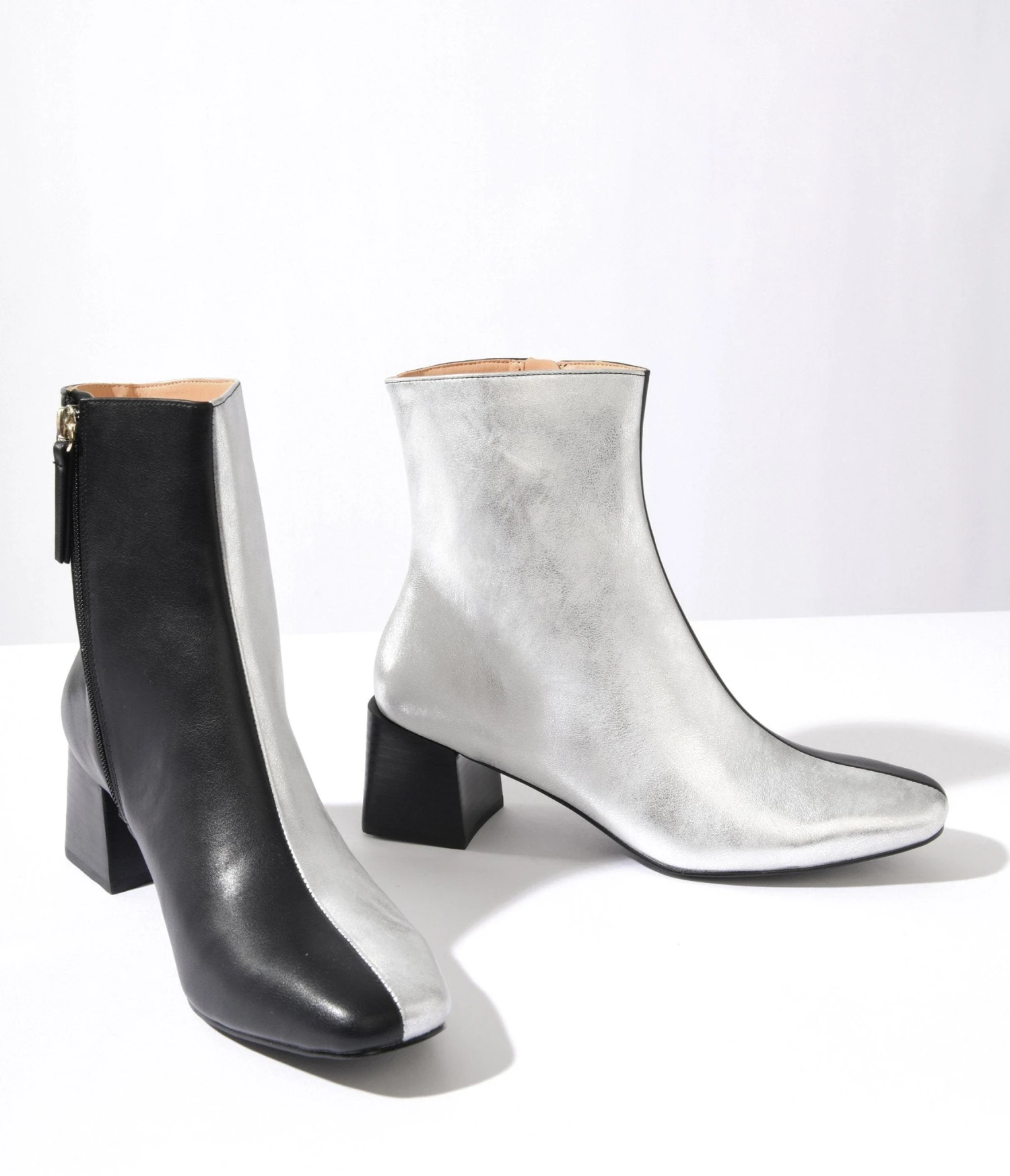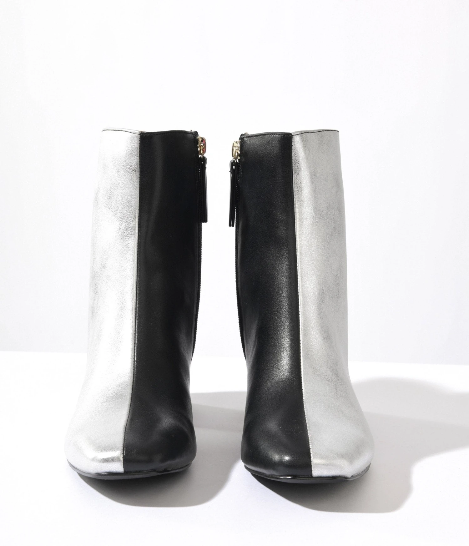 Step into style and make a bold statement with these silver and black leatherette color block booties! Complete with a side zipper and 2.25 inch heels.