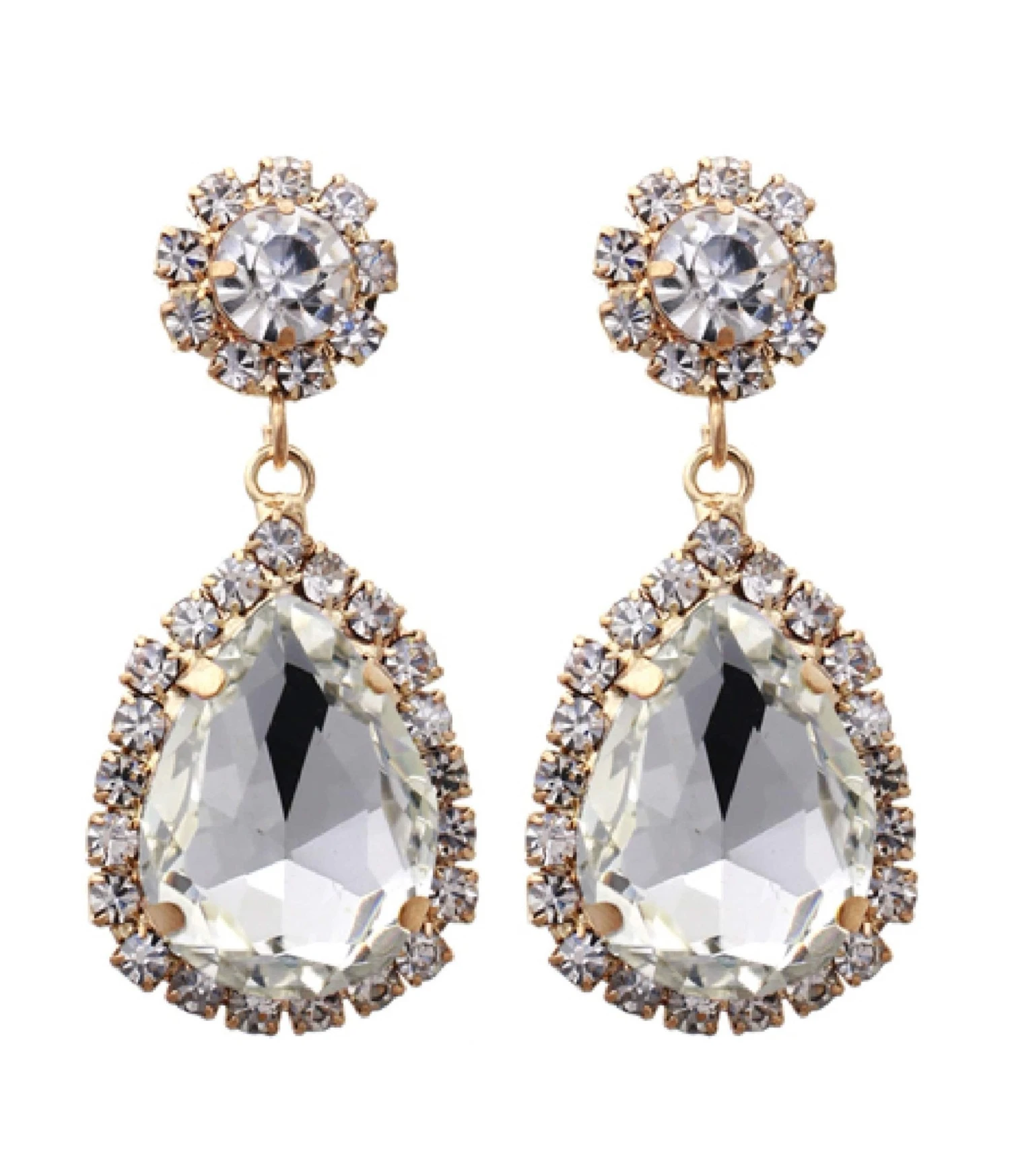 This glamorous pair of 1920s style dangle earrings are set in a gold hardware and boasts silver rhinestones with a eye-catching teardrop center. Complete with post-backs.
